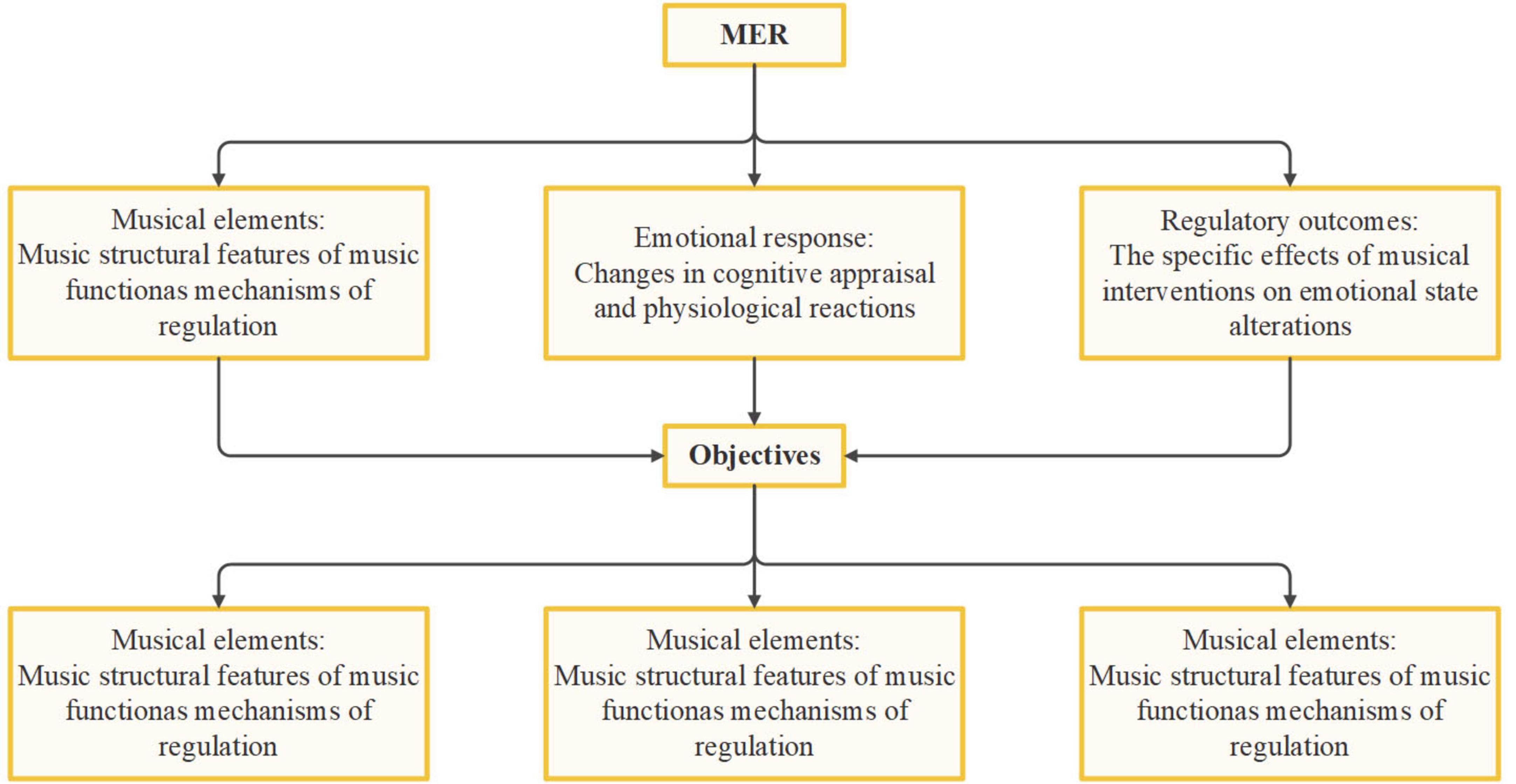 Based on the objectives of the current study and following the theoretical framework proposed by Chong et al. (2024), as shown in Figure 1, MER is operationalized across three dimensions: First, at the level of musical elements, the focus is on how structural features of music (e.g., rhythm, melody, harmony) function as mechanisms of regulation. Second, at the level of emotional responses, attention is directed to changes in cognitive appraisal and physiological reactions. Lastly, at the level of regulatory outcomes, the emphasis is placed on examining the specific effects of musical interventions on emotional state alterations. This framework guided our literature search and analysis.