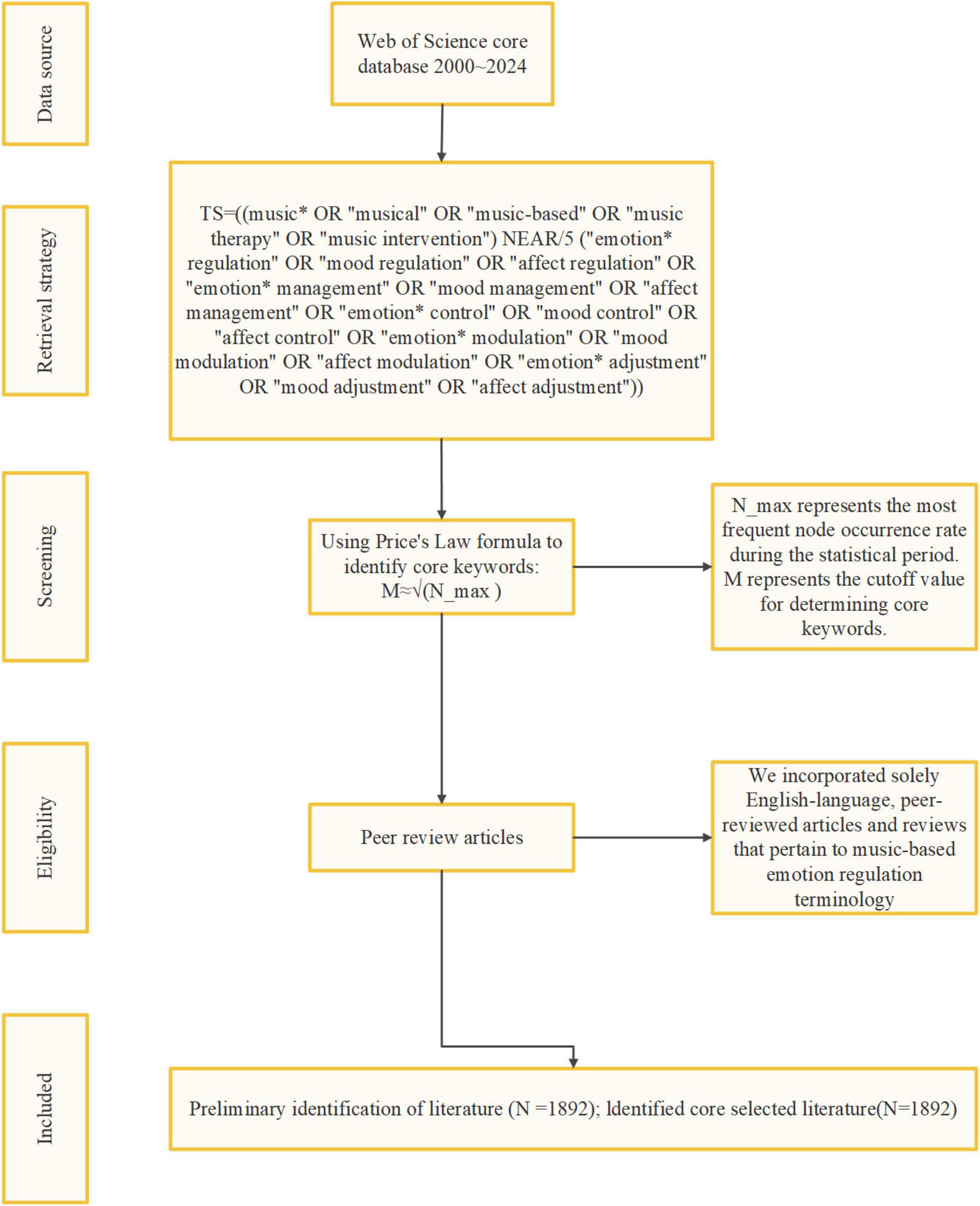 Data were extracted from the Web of Science Core Collection (Science Citation Index Expanded and Social Sciences Citation Index), spanning from 2000 to 2024. The search strategy (Refer to Supplementary Appendix A) incorporated terms related to music-based emotion regulation, yielding a comprehensive dataset of relevant publications. To ensure analytical rigor and accessibility, only peer-reviewed articles and reviews published in English were included in the analysis. The retrieval strategy as shown in Figure 2.