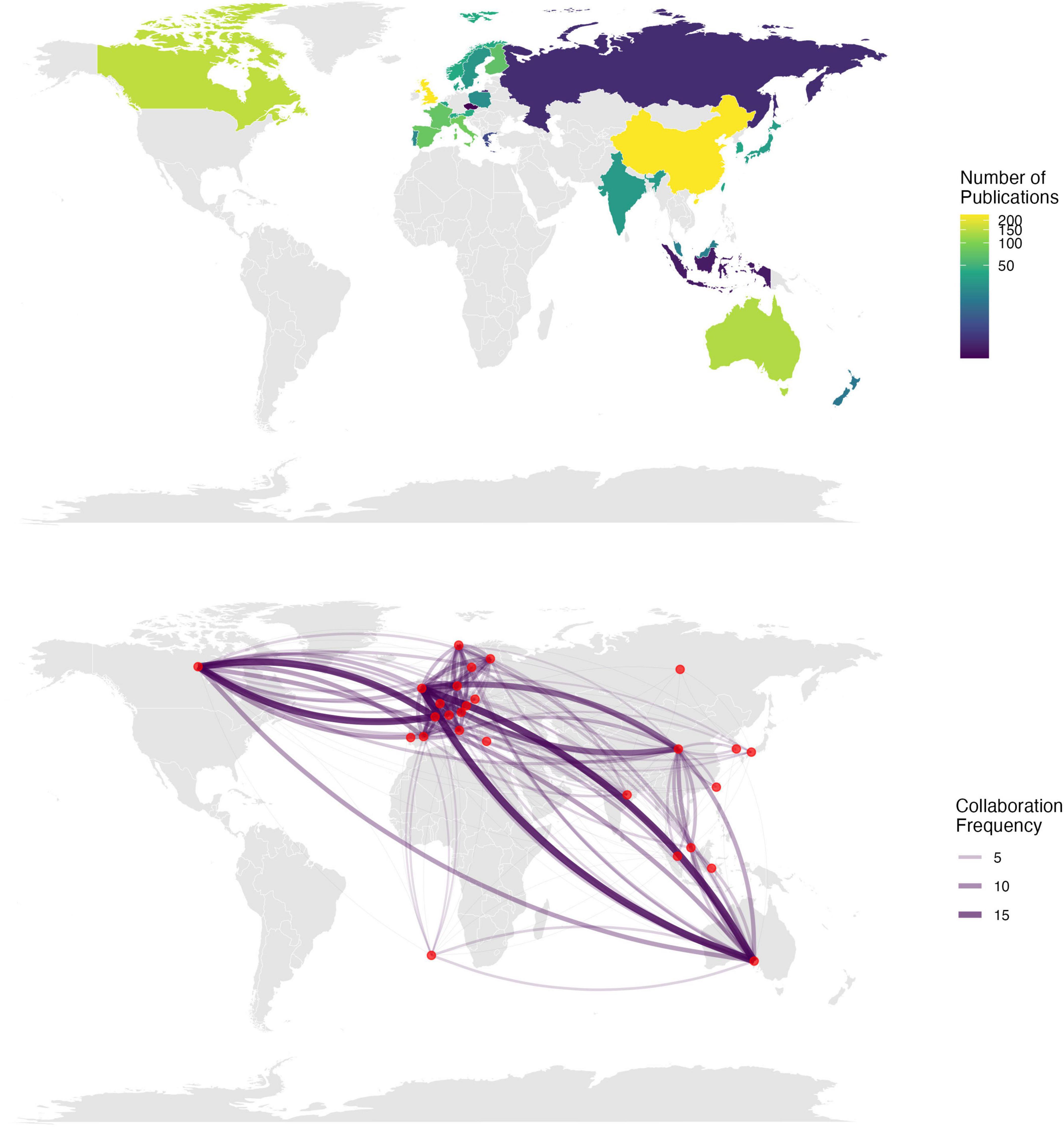International collaboration analysis reveals a globally connected network dominated by Western institutions (see Supplementary Appendix B3 for country-level collaboration network visualization). The cross-national collaboration network shows high density (0.89) and clustering coefficient (0.88), with a relatively short average path length (1.96), exhibiting small-world network characteristics. Canada shows the strongest international collaboration tendency (degree centrality = 73, betweenness centrality = 6,807.34), followed by China (degree centrality = 45, betweenness centrality = 6,018.89). The collaboration patterns demonstrate both geographic proximity effects and cross-regional knowledge exchange.