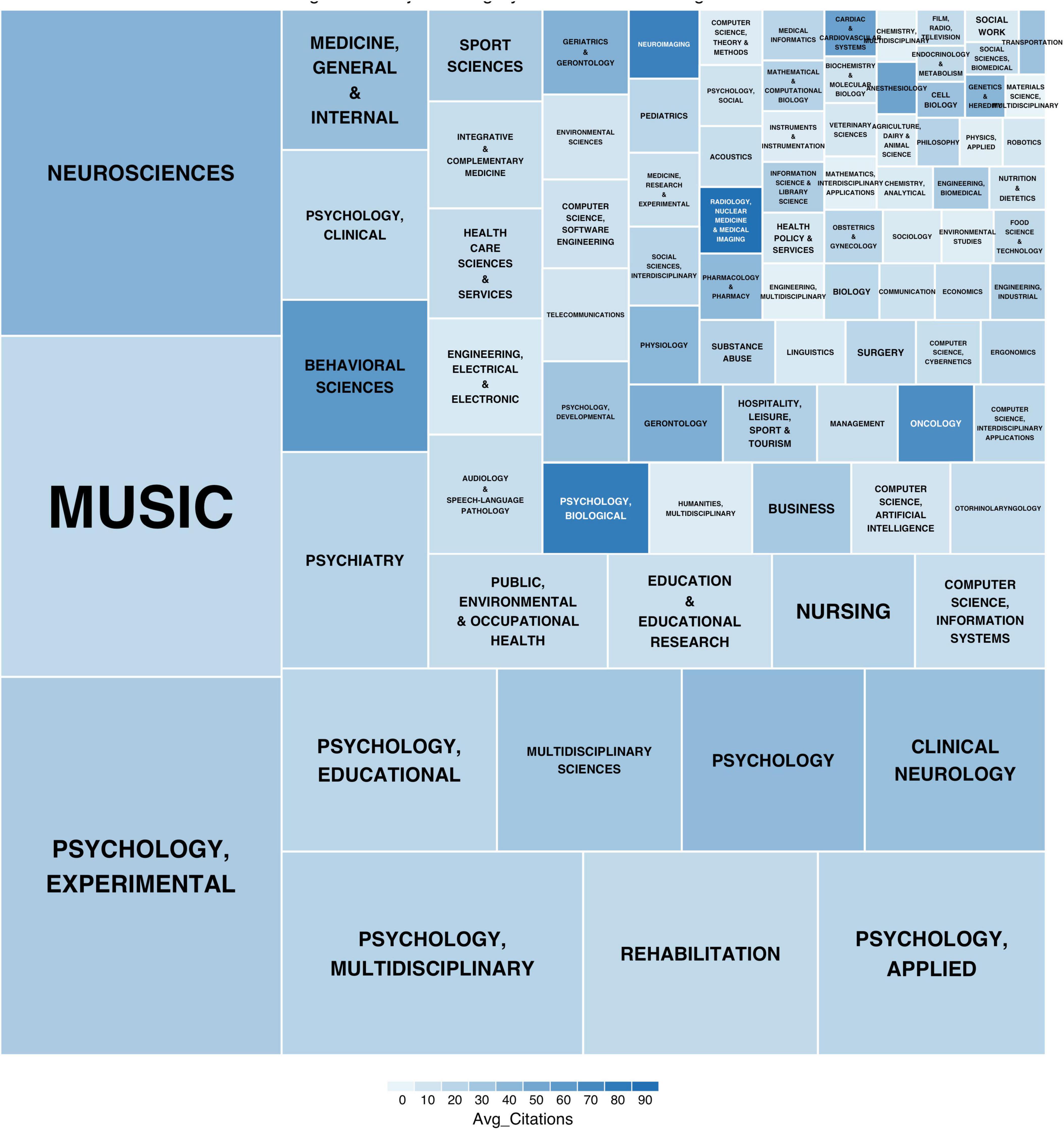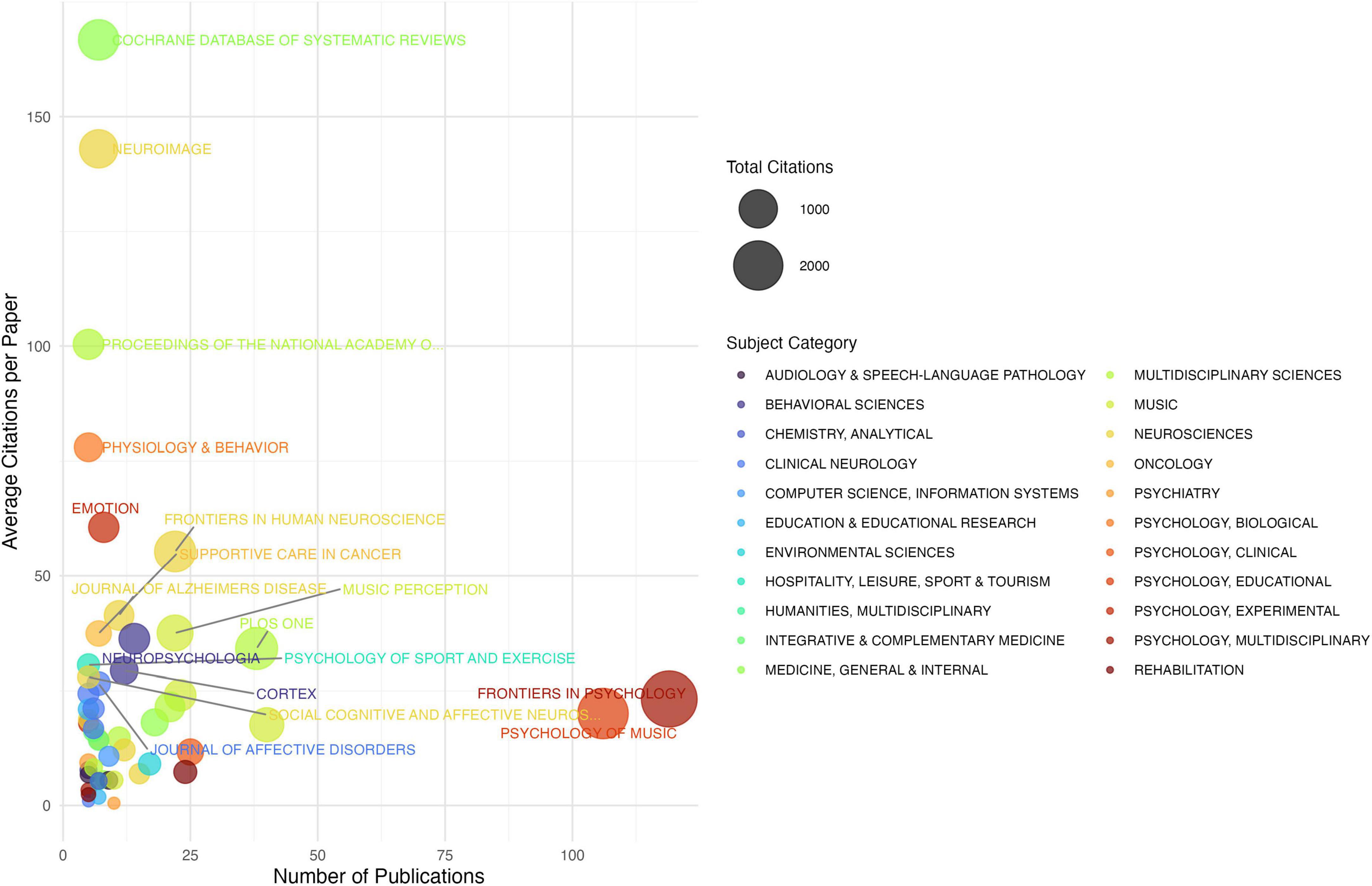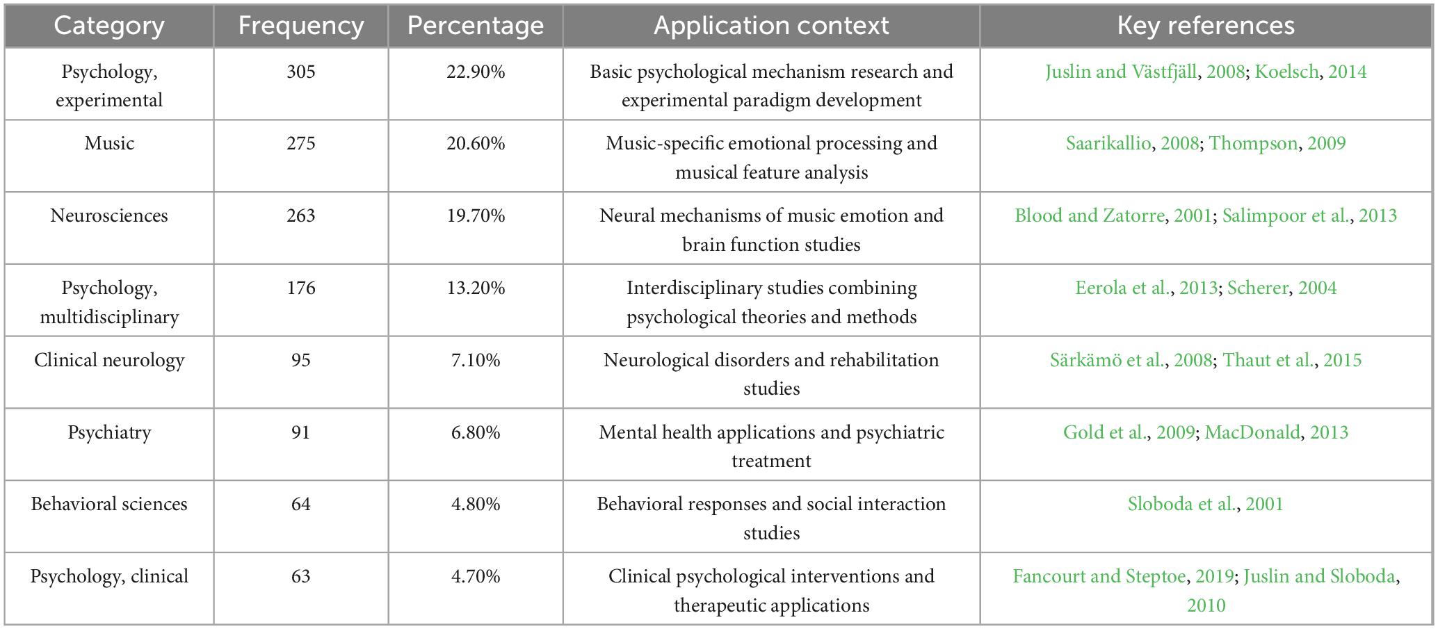 Publication outlets demonstrate clear stratification, with 15 core journals accounting for 60.3% of total publications. The field is primarily anchored in psychology and neuroscience journals, with Frontiers in Psychology (119 articles) and Psychology of Music (106 articles) leading in volume. Impact analysis identifies differential patterns - specialized journals like Frontiers in Human Neuroscience show higher citation impact (55.32 citations/article), while general psychology journals contribute to broader dissemination. The disciplinary analysis reveals substantial interdisciplinarity, with 44.04% of papers involving multiple disciplines. The core disciplinary triangle comprises experimental psychology (305 articles), musicology (275 articles), and neuroscience (263 articles), forming distinct but interconnected research communities (modularity = 0.571). The demonstration of journal impact and disciplinary coverage in MER research as shown in Figure 5. The illustration of subject category distribution and integration as shown in Figure 6.