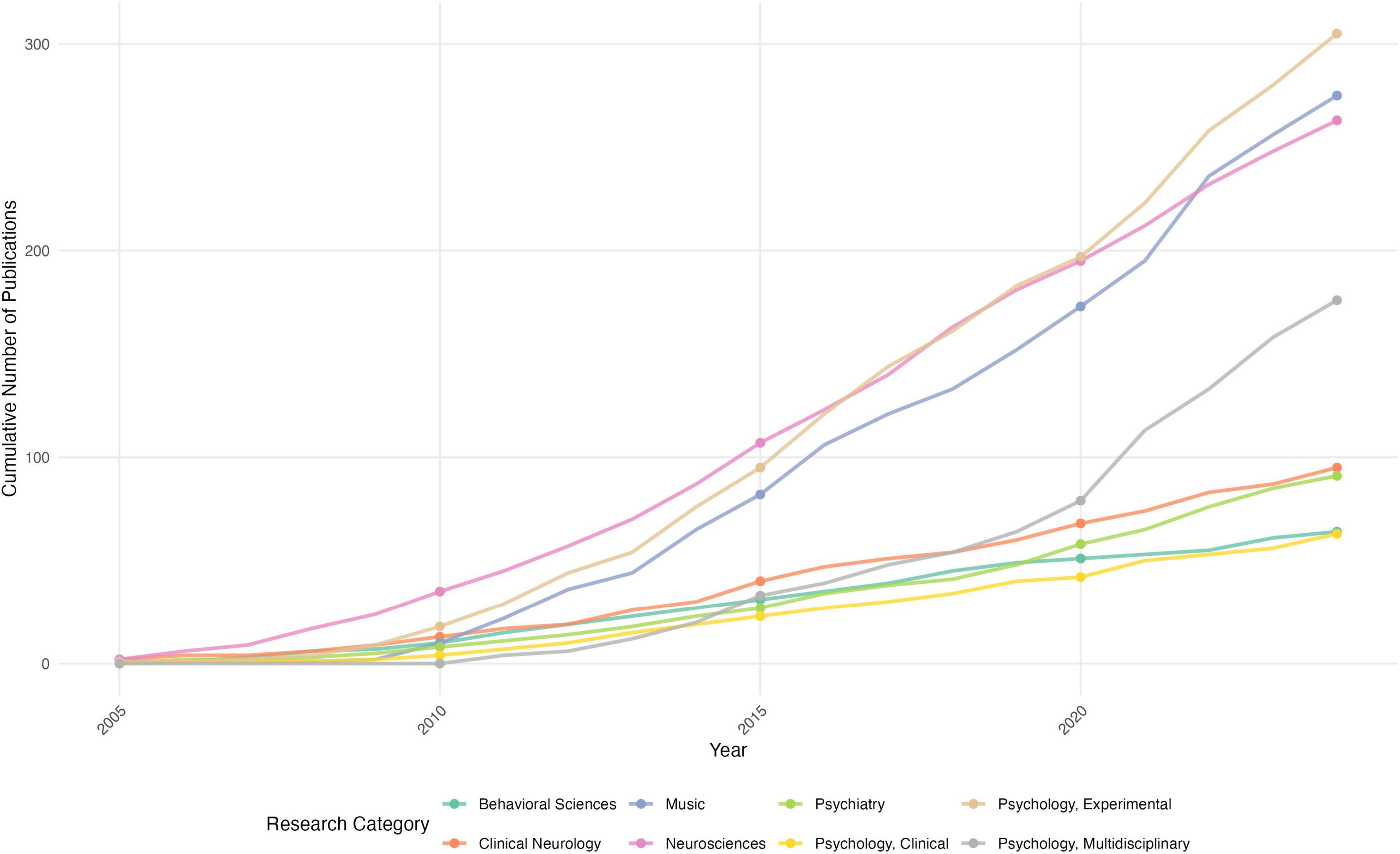 The temporal analysis reveals a paradigm shift from descriptive to mechanism-focused investigations. Early disciplinary interactions (2000–2010) primarily occurred between psychology and musicology (154 papers), while recent research (2015–2024) shows increased integration with neuroscience (263 papers) and computer science (134 papers). This evolution reflects the field’s movement toward more sophisticated, multi-method approaches to understanding MER.
