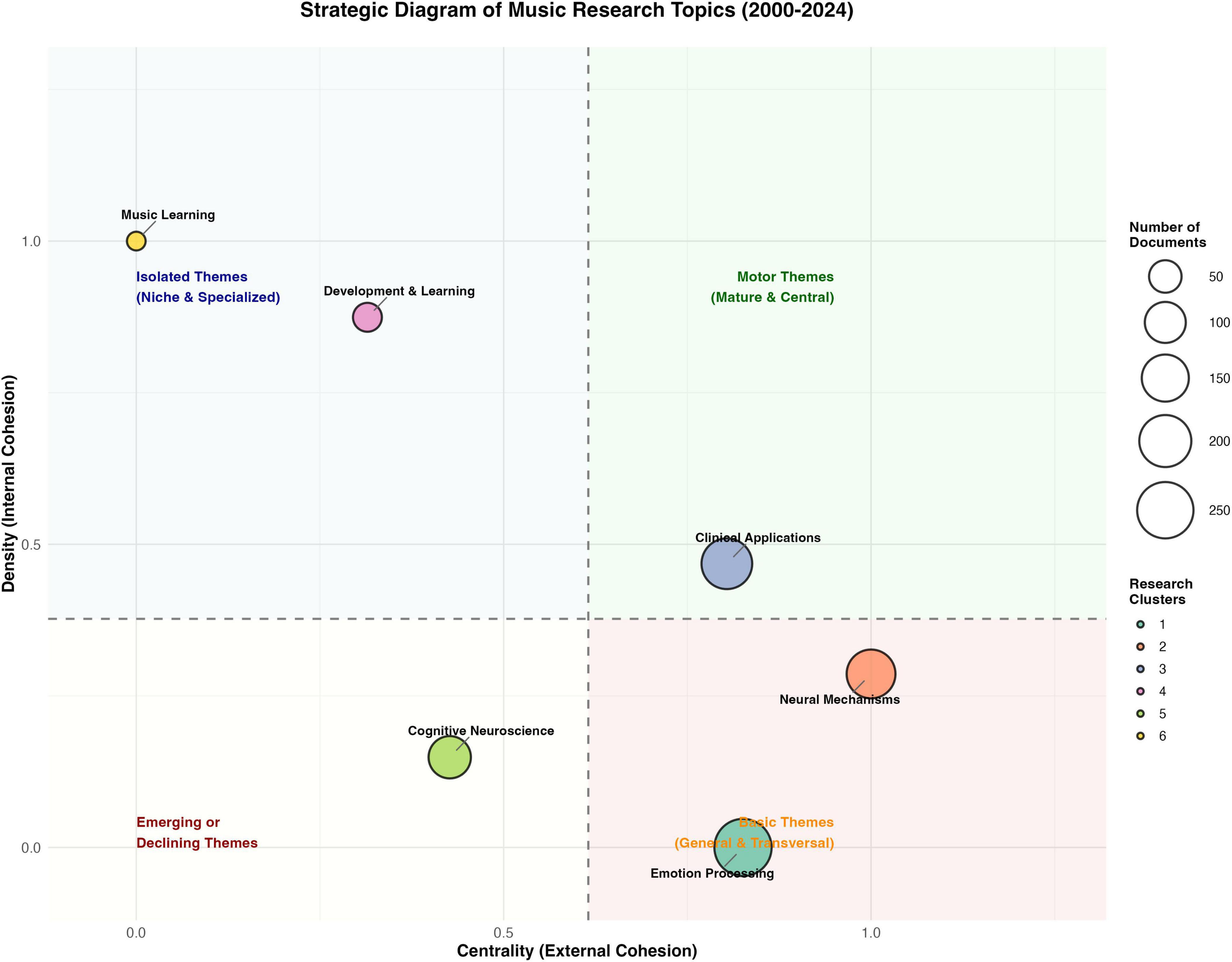 Research themes in MER studies demonstrate clear clustering patterns with evolving characteristics. Theme clustering analysis identified ten major research directions, with patient treatment (231 publications), music regulation (211 publications), and emotional experience (206 publications) forming the primary clusters. Network analysis of these themes shows distinct structural features (network density = 0.0306, clustering coefficient = 0.2930), indicating clear thematic boundaries while maintaining interconnections. Notably, research on neural mechanisms demonstrates the highest average citation impact (35.58 citations per paper), followed by studies on children and cognition (30.23 citations) and emotional experience (27.87 citations). The strategic diagram of research topics is shown in Figure 9.