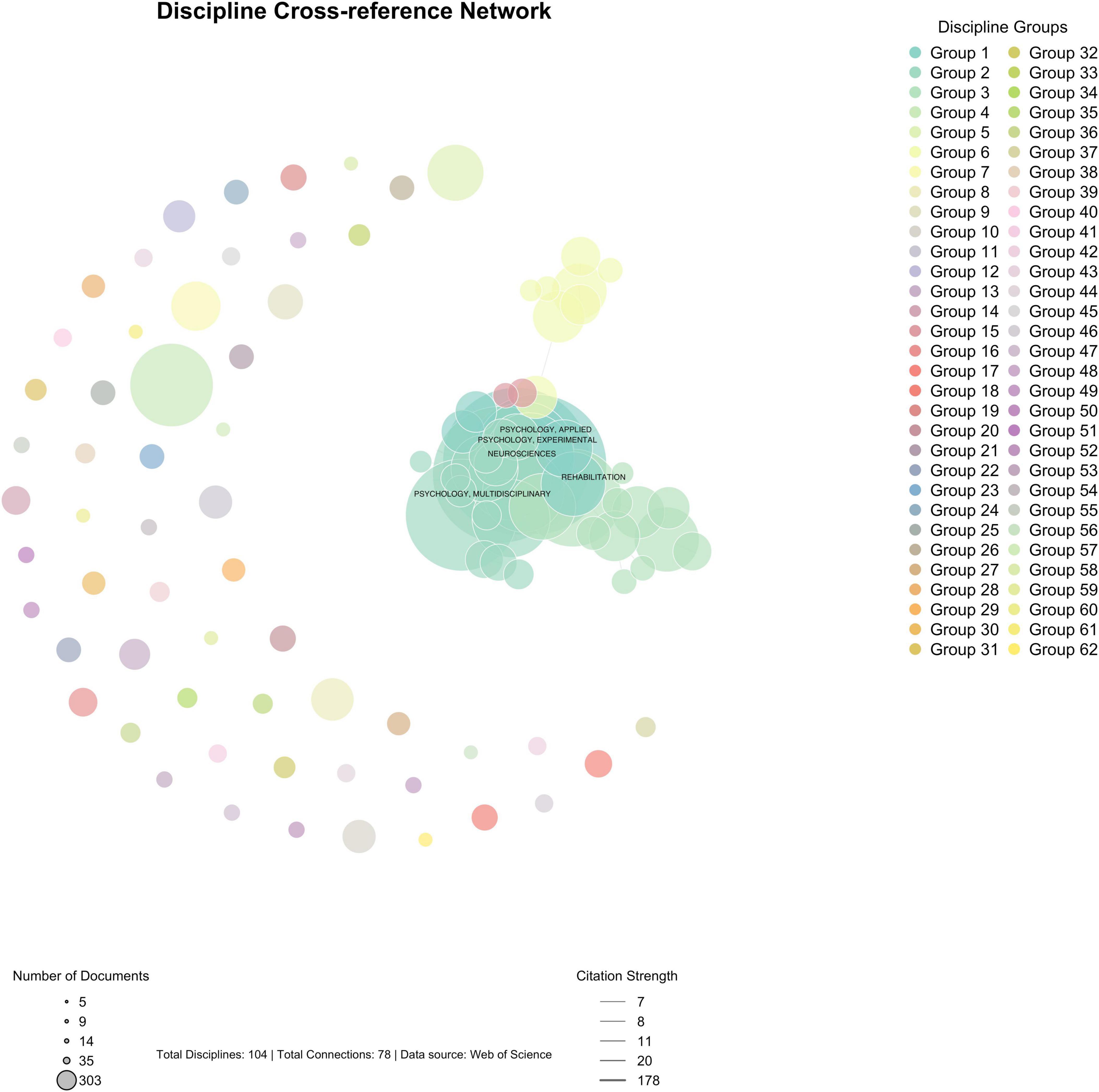 The interdisciplinary analysis of MER research reveals a complex knowledge integration pattern across multiple domains. The illustration of discipline cross-reference network is shown in Figure 11. The field encompasses 154 disciplinary categories, forming a multidisciplinary network centered on psychology, musicology, neuroscience, and medicine. Among these, experimental psychology (305 articles, 9.38%), musicology (275 articles, 8.45%), and neuroscience (263 articles, 8.08%) constitute the primary disciplinary foundations. The interdisciplinary network demonstrates relatively loose structural characteristics (network density = 0.0306, average path length = 5.8487, clustering coefficient = 0.2930), indicating distinct knowledge boundaries while maintaining cross-disciplinary connections.