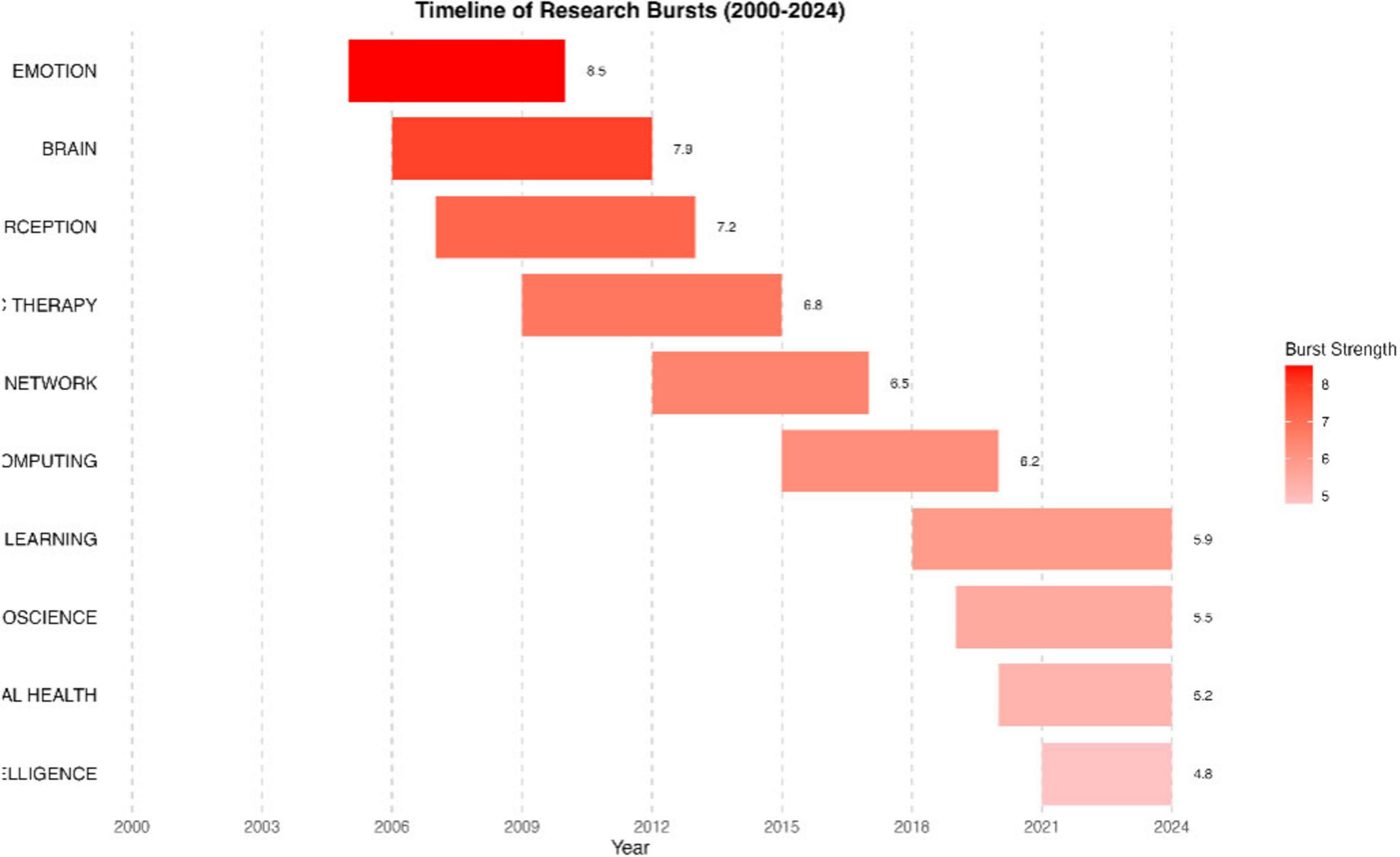 Burst term analysis of MER research reveals distinct evolutionary patterns in research frontiers from 2000 to 2024. The analysis identified 743 burst terms with an average duration of 1.47 years and a right-skewed burst intensity distribution (mean: 1.648, median: 0.000, max: 7.000), indicating rapid topic iteration. The illustration of research bursts is shown in Figure 12. Early-stage bursts (2000–2015) centered on theoretical constructs like “emotion recognition” and “MPMC affect theory”. Mid-stage bursts (2016–2020) shifted toward methodological innovations, exemplified by “canonical correlation analysis” and “bidirectional retrieval”. Recent bursts (2021–2024) demonstrate strong technological convergence, with terms like “fuzzy cognitive maps” and “embeddings” showing sustained intensity. Notably, neuroscience-related terms maintain high persistence with an average burst intensity of 2.333, reflecting the field’s continued emphasis on neural mechanisms.