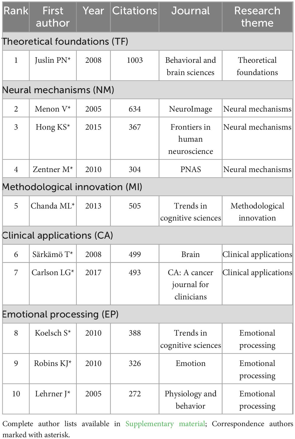 Temporal analysis of citation patterns reveals distinct theoretical foundations across different development stages. Early-stage citations (2000–2013) primarily centered on emotion regulation frameworks and music psychology theories, with Juslin and Västfjäll (2008) BRECVEMA framework receiving the highest citations (1,003 citations, 62.69 per year). The middle stage (2014–2019) witnessed increased citations in neuroscience studies, exemplified by Menon and Levitin (2005) work on neural reward mechanisms (634 citations). Recent citations (2020–2024) show growing interest in clinical applications and technological integration, with emerging focus on real-time measurement and intervention approaches. The citation half-life analysis indicates the theoretical base of MER research has maintained strong vitality, with 67.3% of foundational works still actively cited in recent publications.