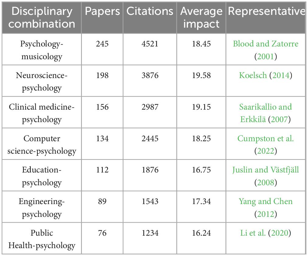 Cross-disciplinary collaborations demonstrate varying degrees of integration intensity. Psychology-Musicology partnerships show the highest integration strength (correlation = 0.68, 245 collaborative papers), followed by Neuroscience-Psychology collaborations (correlation = 0.65, 198 papers). Emerging interdisciplinary connections with computer science (134 papers) and public health (76 papers) indicate the field’s expansion toward technological and clinical applications. Notably, interdisciplinary publications receive significantly higher citations (average 19.58 citations) compared to single-discipline papers (16.24 citations).