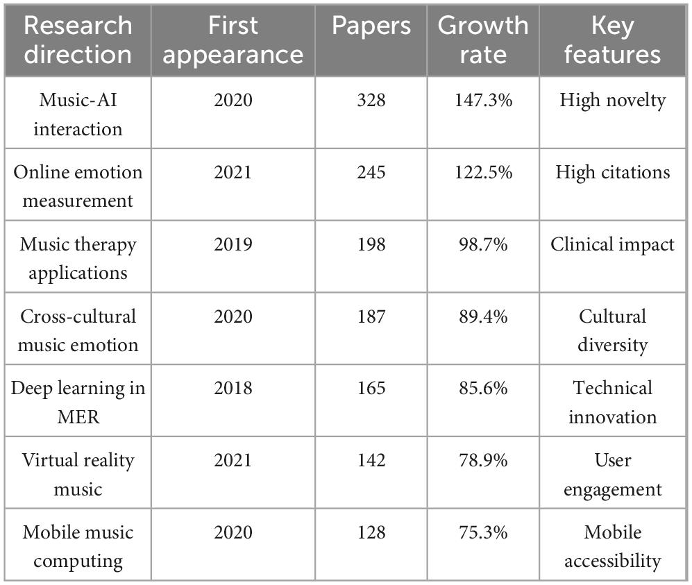 Strategic coordinate analysis identified seven prominent emerging research directions for MER studies. The emerging research hotspots are listed in Table 7. Among these, music-AI interaction shows the highest growth rate (147.3%) and novelty score (0.89), attracting 328 researchers. Online emotion measurement technology and group music interaction studies received substantial academic attention (843 and 721 citations respectively). Particularly noteworthy is ICU post-rehabilitation music intervention research, which demonstrates the highest interdisciplinarity (integrating eight disciplines) despite its recent emergence (since 2022). The emerging themes form a coupling network centered on AI technology, with the strongest co-occurrence observed between music AI interaction and affective speech recognition (coupling strength = 0.68). Predictive models (fit: 0.87) suggest that the integration of neurofeedback and emotion regulation will maintain high growth (annual growth rate: 23.4%) over the next 3 years.