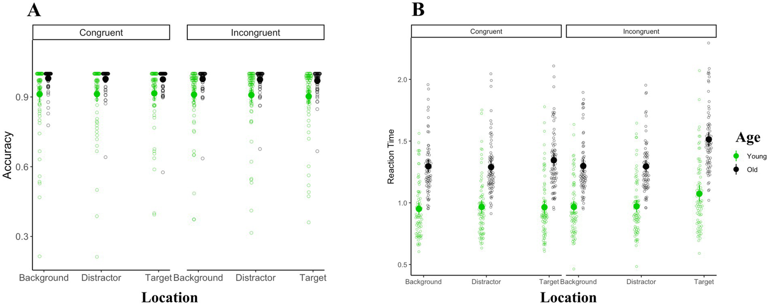 As is shown in Figure 3, the Greenhouse–Geisser corrected ANOVA of accuracy using age-group (young vs. old) as the between-subject factor and congruency (congruent vs. incongruent) and color-word location (background vs. target vs. distractor) as the within-subject factors revealed significant main effects of age [F(1, 145) = 15.3, MSE = 0.1, = 0.1, p < 0.001] and congruency [F(1, 145) = 16.1, MSE < 0.01, =0.1, p < 0.001]. The main effect of word location, as well as any other interaction, were not significant (ps > 0.09).