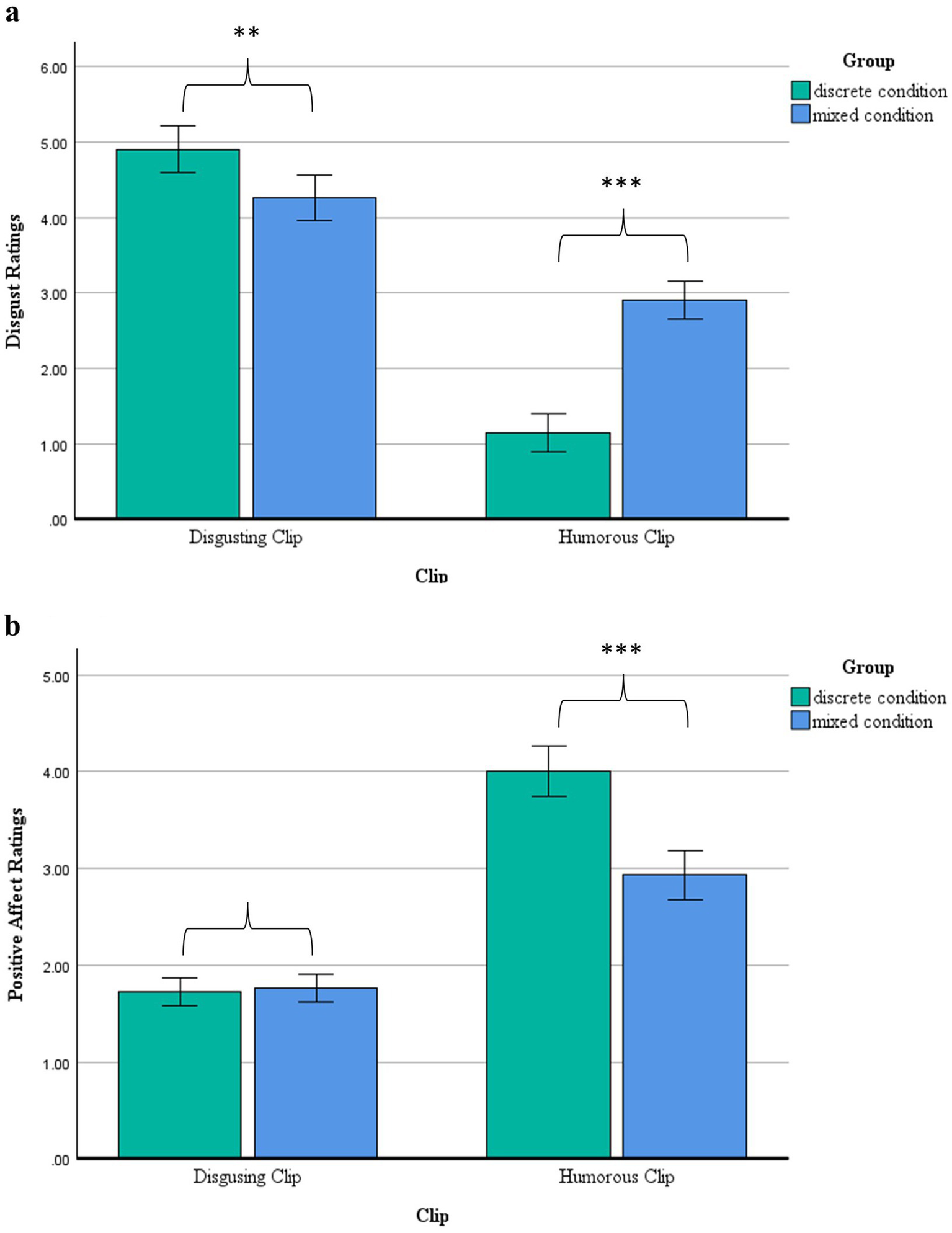 (A) Disgust ratings following the disgusting and humorous clips by condition (discrete vs. mixed) (Study 2). (B) Positive affect ratings following the disgusting and humorous clips by condition (discrete vs. mixed) (Study 2).
