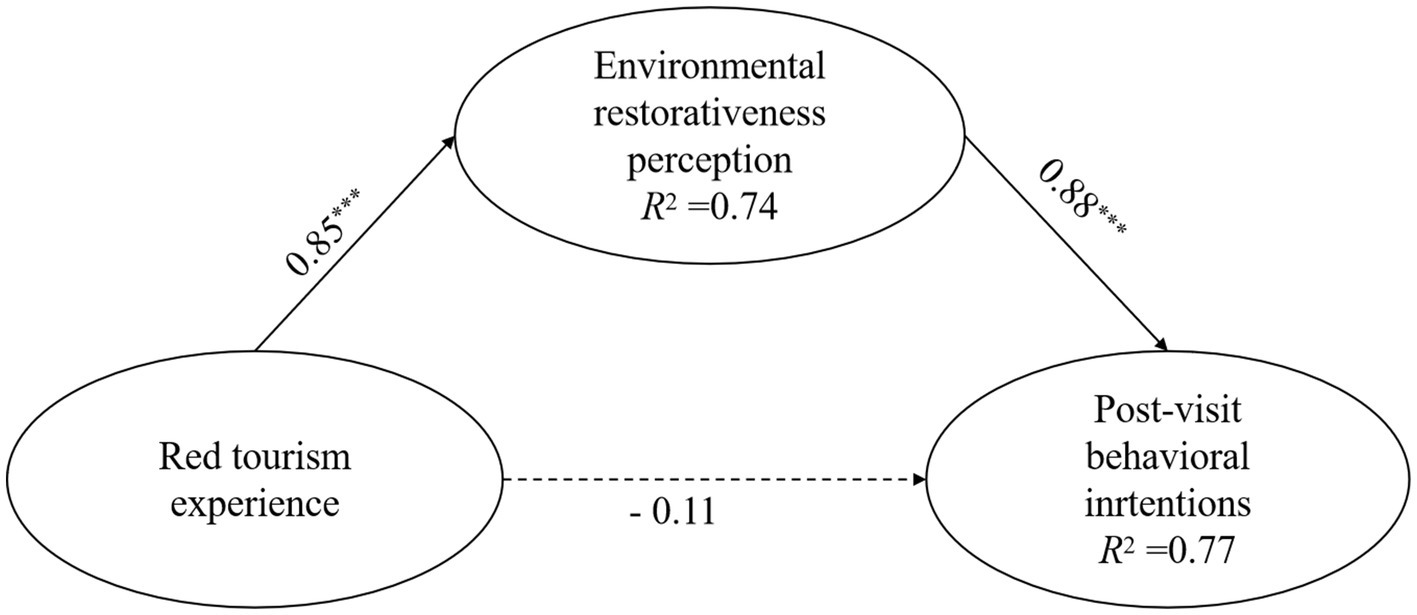 Subsequently, we conducted a supplementary analysis to assess the mediating effect of environmental restorativeness perception (Wen and Ye, 2014). The bias-corrected non-parametric percentile bootstrap method was employed to estimate the confidence intervals for the coefficients. In the first step, the direct path from red tourism experience to post-visit behavioral intentions showed good model fit: χ2 = 38.13, df = 10, RMSEA = 0.05 (CI90% = [0.03, 0.07]), CFI = 0.98, TLI = 0.97, and SRMR = 0.04. After controlling for age, gender, and education level, the red tourism experience significantly predicted post-visit behavioral intentions, β = 0.72, p < 0.001; CI95% = [0.68, 0.80], explaining 52.40% of the variance in post-visit behavioral intentions.