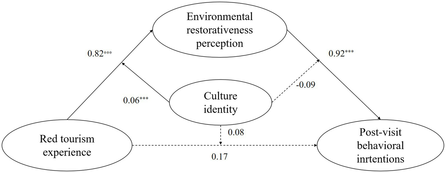 Step 3: Utilizing the coefficient product method to analyze the moderated mediation effect. Cultural identity significantly moderated the relationship between red tourism experience and environmental restorativeness perception β = 0.06, p < 0.001, but not the paths from environmental restorativeness perception to post-visit behavioral intentions, β = −0.09, p > 0.05, or from red tourism experience to post-visit behavioral intentions, β = 0.08, p > 0.05. This indicates cultural identity moderates the first stage of the mediation pathway.