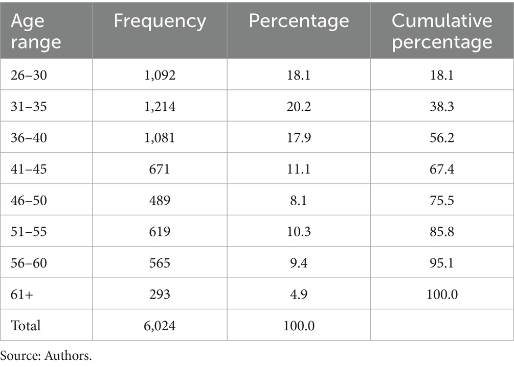 In total, 6,038 teachers from the Chilean school system participated, belonging to age groups ranging from 26 years to 61 + years; 27.4% were men and 72.6% women. This gender distribution is consistent with national statistics on the teaching workforce in Chile (Centro de Estudios Mineduc, 2018). The inclusion criteria were to be a teacher, work in the classroom and have 1 or more years of experience. Although the JUNAEB instruments also include school assistants, only teachers were considered in this study. It should be noted that the data collection reports on the age of the participants at 5-year intervals. This approach, widely used in educational and social research, aims to protect the confidentiality of participants, improve the robustness of statistical analyses by consolidating sample sizes, and facilitate the interpretation of results, thus enabling the effective identification of patterns and trends (Dyrting et al., 2022). Age was reported according to the age ranges shown in Table 1.