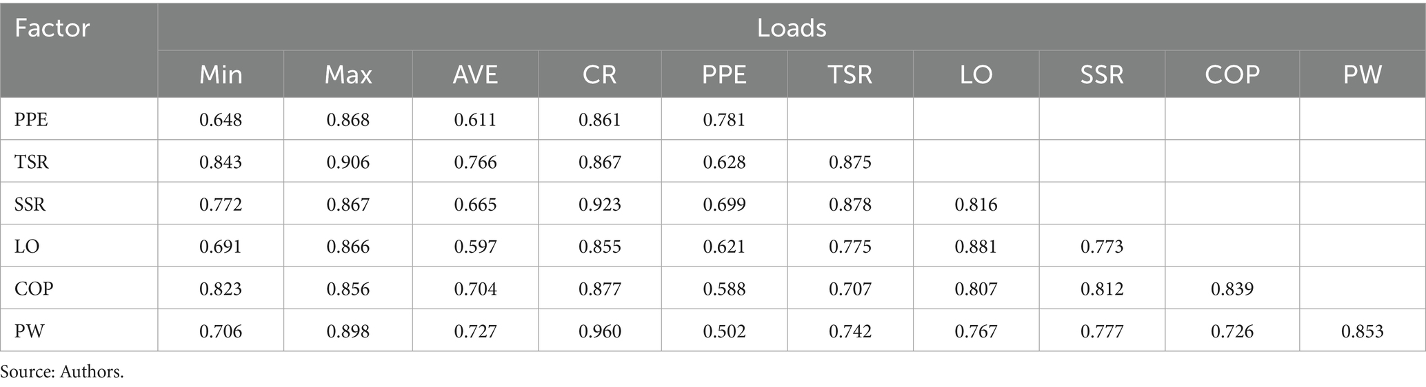 To evaluate convergent validity, the factor loadings of the items on each latent variable are examined, with the expectation that the indicators demonstrate loadings greater than 0.5 and are statistically significant (Hair et al., 1999). This assessment is critical, as it indicates that the items effectively capture the underlying construct they are intended to measure. Following this, the reliability of the factors is calculated using the Composite Reliability (CR) coefficient and the Average Variance Extracted (AVE), adhering to the criteria established by Fornell and Larcker (1981). Specifically, an AVE greater than 0.5 suggests good convergence, while a CR exceeding 0.7 indicates adequate internal reliability.