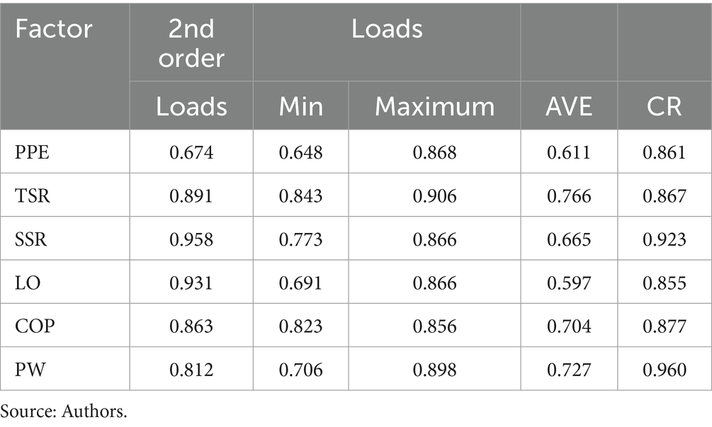 For the second-order model, the proposed model also demonstrates a good fit to the data (X2 = 7,960.569; DF = 344; p < 0.001; RMSEA = 0.061; CFI = 0.953; TLI = 0.948). The reliability and convergent validity indices are presented in Table 5.