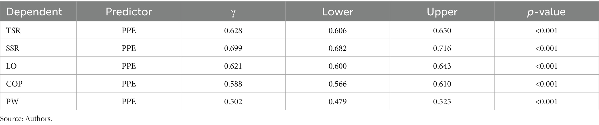 As shown in Table 6, the Physical Environment (PPE) has a significant and positive influence on all latent variables. Standardized estimates range from 0.502 (95% CI: 0.479–0.525, p < 0.001) for Personal Wellbeing (PW) to 0.699 (95% CI: 0.682–0.716, p < 0.001) for Teacher-Student Relationship (TSR).