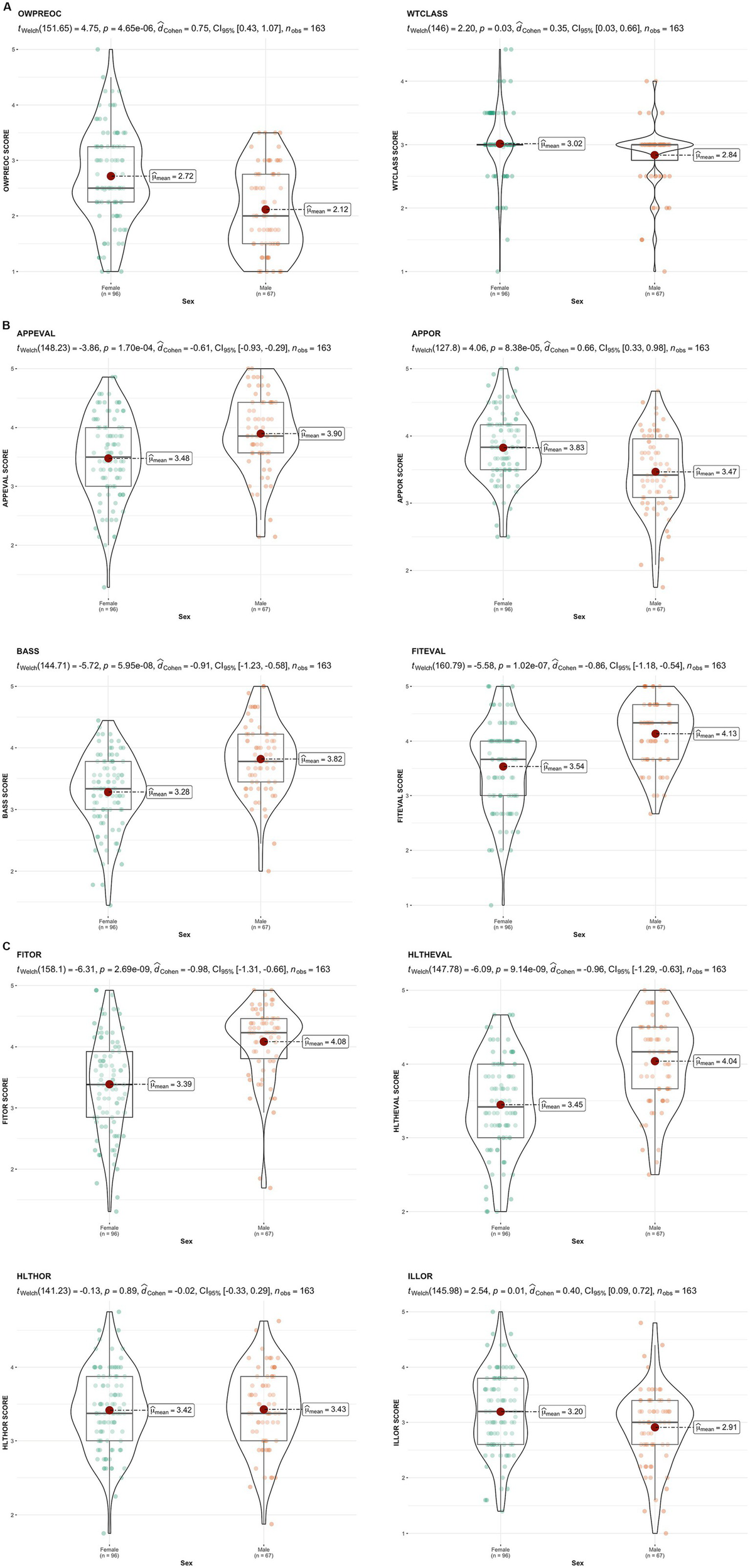 Figure 1. (A–C) MBSRQ. APPEVAL, appearance evaluation; APPOR, appearance orientation; FITEVAL, fitness evaluation; FITOR, fitness orientation; HTLHEVAL, health evaluation; HTLHOR, health orientation; ILLOR, illness orientation; BASS, body area satisfaction; OWPREOC, overweight preoccupation; WTCLASS, self-classified weight.