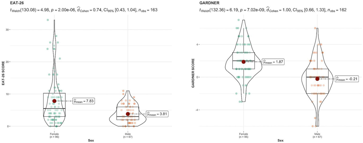 Figure 3 illustrates the values obtained from the EAT-26 and Gardner’s assessment. Statistically significant differences were observed between the male and female participants in both groups, with a large effect size.