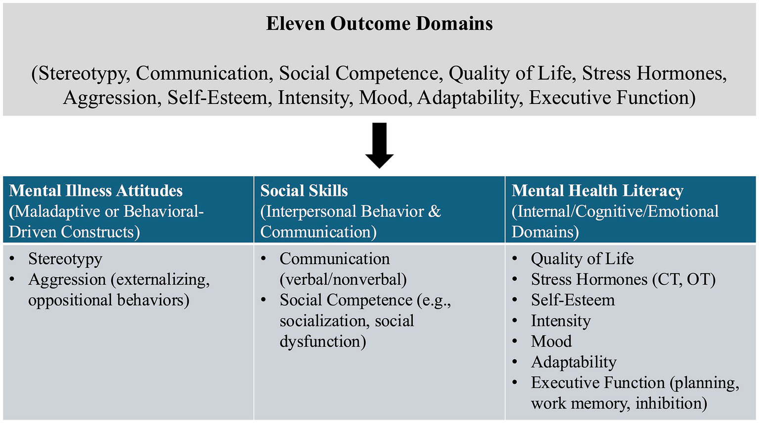 Flowchart mapping the eleven outcome domains onto three overarching constructs. CT, cortisol; OT, oxytocin.
