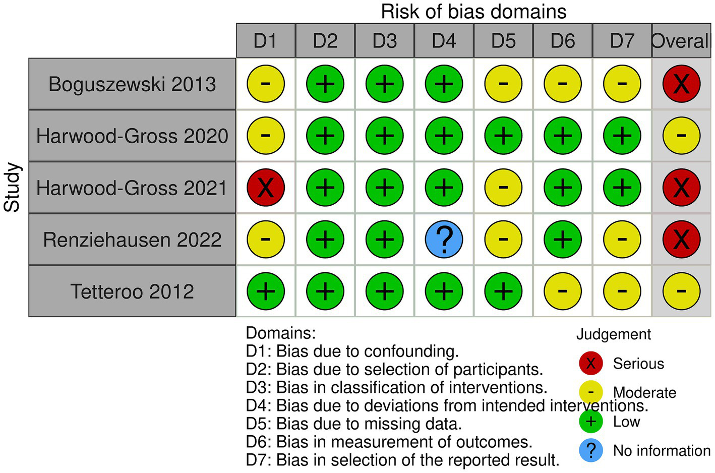 A risk of bias analysis was performed for all study designs to assess the included studies’ methodological rigor and internal validity. Appropriate assessment tools were used for each study type, and according to the Cochrane Collaboration, RCTs adapted the Rob 2.0 tool (Higgins et al., 2011). This instrument encompasses the following areas: bias from randomization, bias due to non-consistent interventions, bias due to incomplete outcome information, bias in outcome measurement, and bias in the reported outcome selection. In the case of non-RCTs, the risk of bias was determined using a modified version of the ROBINS-I (Risk Of Bias In Non-randomized Studies– of Interventions) measure (Sterne et al., 2016). The tool assesses the following areas: confounding bias, participant selection bias, intervention classification bias, deviations from planned exposures or interventions, missing data bias, outcome measurement bias, and outcome selection bias of reported results. Two independent reviewers (who extracted data themselves) conducted risk of bias assessments. For this survey, they used forms made in Covidence, with templates for specific risk of bias calculators. After each reviewer independently extracted data, they agreed to reconcile any disagreements and ensure their assessments were correct. Most RCTs were considered to have either “Low” or “Some concerns” in areas including randomization, outcome measurement, and reporting. However, two RCTs (Davis and Byrd, 1975; Movahedi et al., 2013) had a “High” overall risk, primarily due to randomization errors or deviations from the intervention. Of the non-randomized trials, the combined scores ranged from “Moderate” to “Serious,” typically due to confounding variables or not properly recording outcome data. None of the studies included received a “Critical” rating that would discredit them. Despite these disparate sources of bias, most studies were of satisfactory quality, and the aggregated findings must be viewed cautiously. Nevertheless, they must provide valuable guidance as to how OCS interventions might influence the mental health of children and adolescents with disabilities (Figures 2, 3).