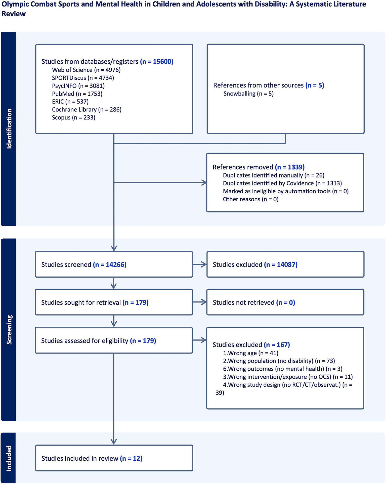 Seven electronic databases (Scopus, ERIC, PsycINFO, PubMed, Cochrane Library, Web of Science, and SPORTDiscus) were considered to search for RCTs and CTs studies focused on OCS-based programs for children and adolescents with disabilities. The literature search across the seven databases was conducted between July 23 and July 26, 2023. The search strategy targeted four significant variables: (1) OCS, (2) mental health, (3) the demographic target group of children and adolescents with disabilities, and (4) study designs and associated terminologies. The review focused solely on Olympic combat sports (OCS)—boxing, judo, karate, taekwondo, wrestling, and fencing—which have received official recognition from the International Olympic Committee (IOC). This selection ensured definitional clarity, consistent intervention typologies, and alignment with the original PROSPERO protocol. Given the vast scope of martial arts and combat sports, narrowing the focus to OCS allowed for a more structured analysis based on standardized rules, global recognition, and high-performance contexts. While promising evidence exists for other combat sports, such as Brazilian jiu-jitsu (Bueno et al., 2023), capoeira (Fernandes et al., 2022), and mixed martial arts (MMA) (Phung and Goldberg, 2021), these were excluded due to their non-OCS status. Moreover, Olympic combat sports receive significant research, funding, and policy attention, facilitating comparability, access to quality data, and scientific investigation while avoiding an overly broad scope. Literature not in English was included where a translation in English existed or could be obtained with the help of the review team. Additionally, we used a snowballing approach, screening all articles included in our study through reference lists alongside database searches. Five additional studies were identified for a full-text review from this process, but they failed to meet our inclusion criteria, which led to their exclusion from the final synthesis. Our review only included studies that were published starting in 1975. Our preliminary scoping review determined that 1975 was the publication year of the earliest acceptable study, satisfying all inclusion criteria, which led to our decision. In addition, the mid-1970s saw the development of organized physical activity programs alongside scientifically rigorous methods within disability research (Rimmer, 1999; Sherrill, 1998). Also, studies published from 1975 maintain methodological consistency and preserve historical relevance.