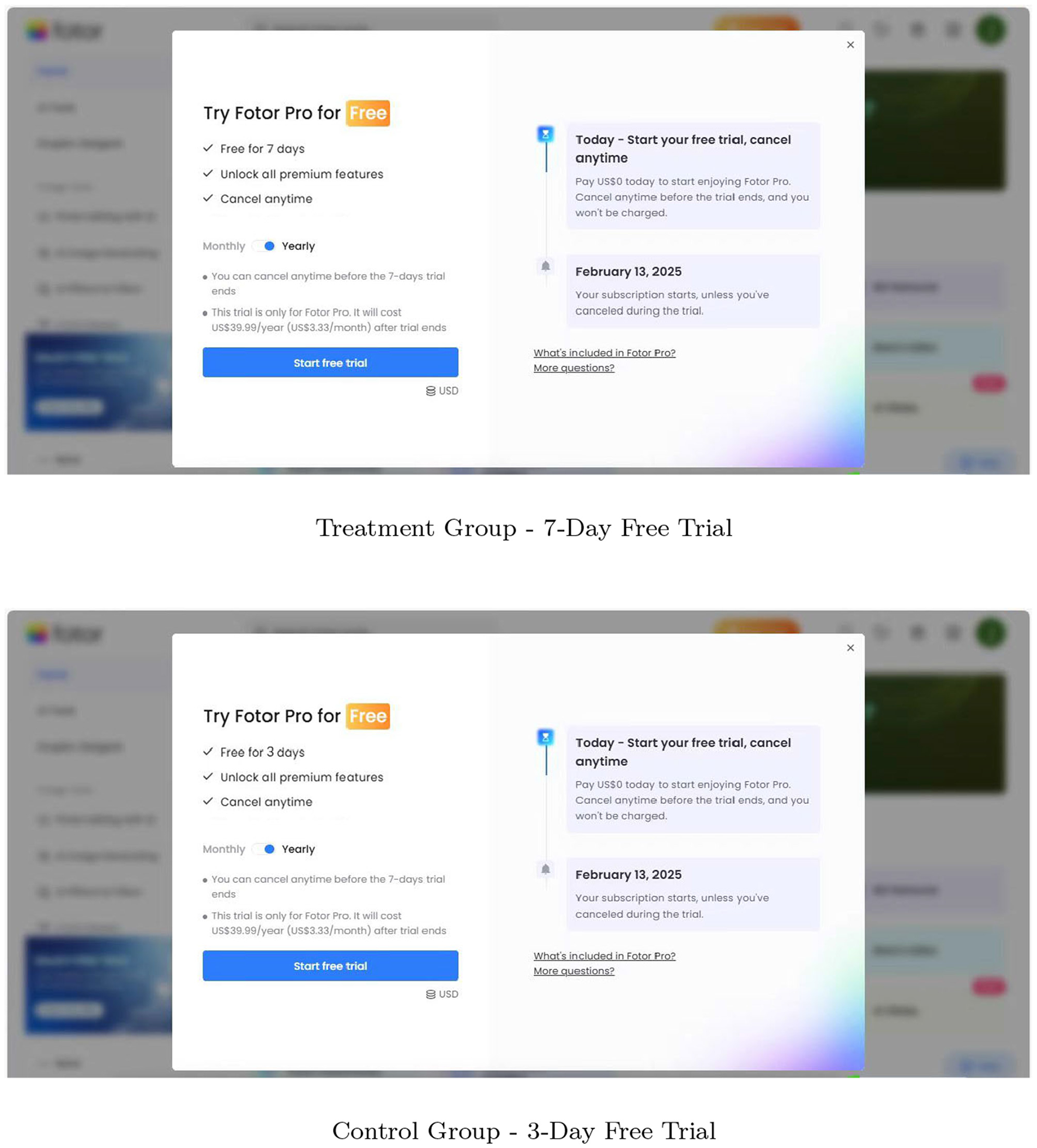 Both groups experienced identical trial interactions: the system periodically displayed prompts encouraging users to explore premium features during the free trial. Users could cancel the auto-renewal at any time during the trial. If no cancellation occurred before the trial expiration, the subscription automatically transitioned to a paid plan according to the selected billing cycle (e.g., monthly or annually).
