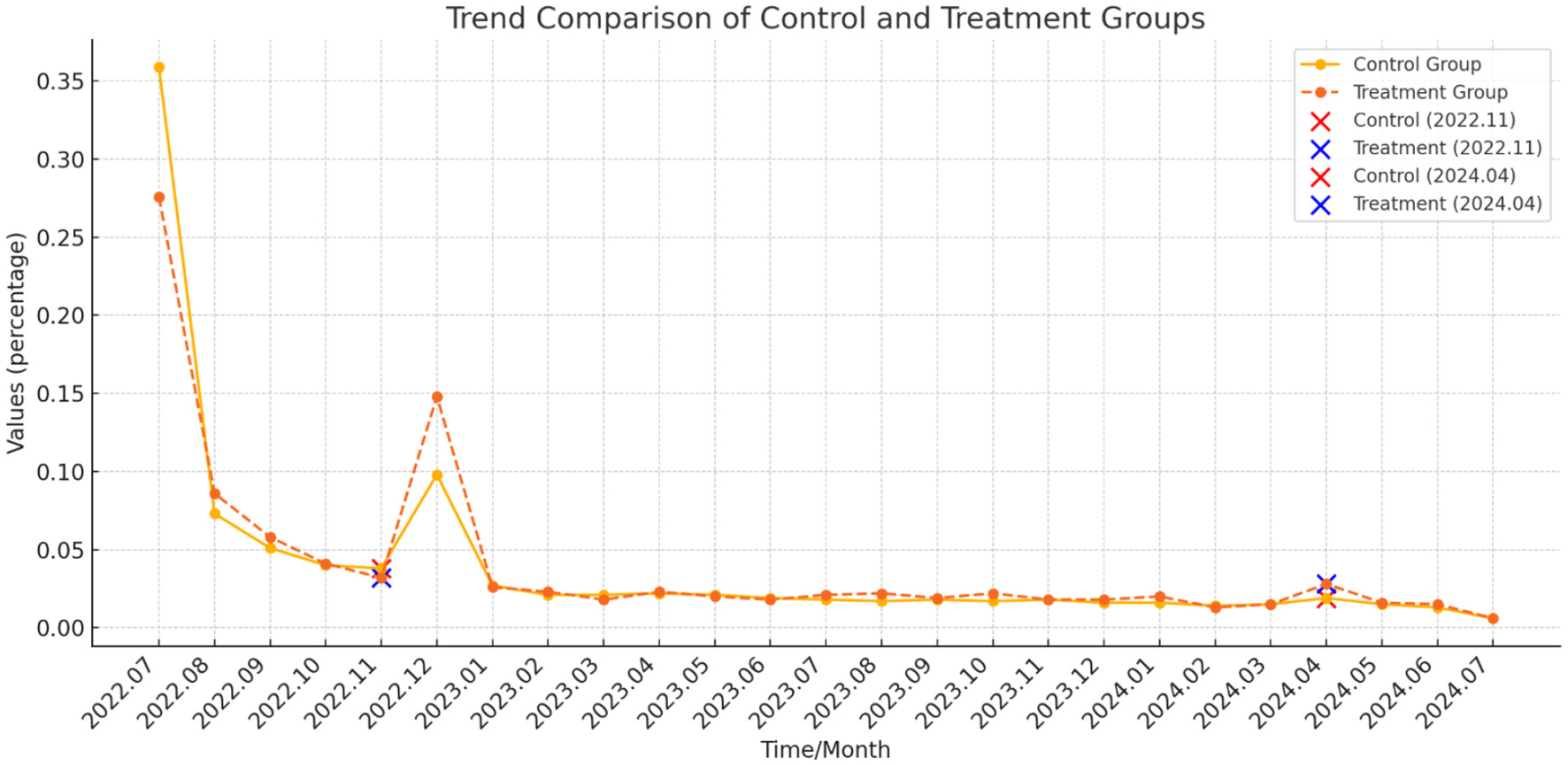 Additionally, we examined the impact of two key promotional phases on user conversion behavior: (1) a feature-based promotion following the launch of an AI-generated content (AIGC) functionality on November 18, 2022, lasting for 1 month, and (2) a price discount campaign offering a 20% discount from April 15 to April 28, 2023.