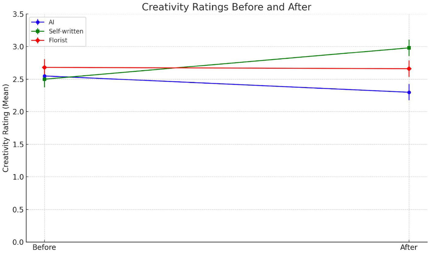 These results support Hypothesis 1a in the domain of creativity: only attribution to a close friend produced a meaningful shift in perception. Attributions to AI and socially distant humans failed to reframe the message as more (or less) creative, reinforcing the notion that in emotionally meaningful exchanges, creativity is evaluated not just on the basis of linguistic markers but through a lens of inferred emotional investment.