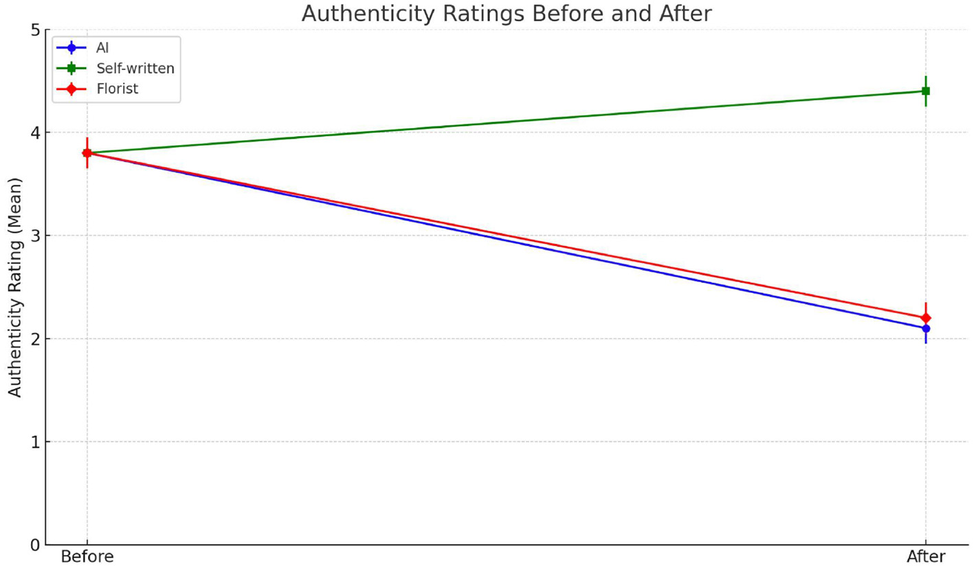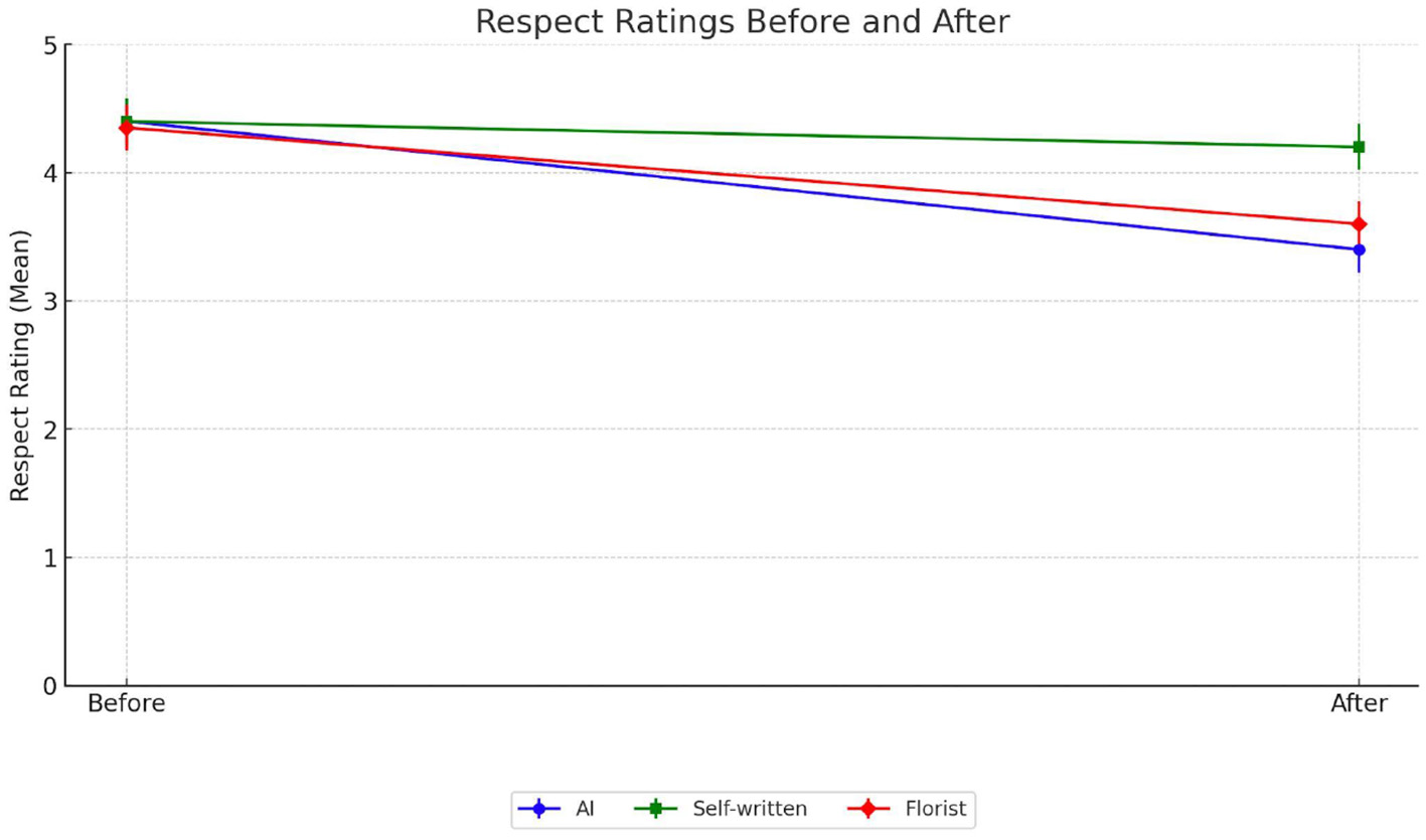 Respect, as a moral and symbolic gesture, conveys recognition of the other's emotional gravity, especially in contexts like childbirth or terminal illness. Unlike creativity or authenticity, respect is often associated with social norms of attentiveness and appropriateness. We hypothesized that respect, too, would be shaped by source attribution, albeit potentially in a more normatively anchored way. In the AI condition, respect ratings dropped from 4.42 (SD = 0.90) to 3.40 (SD = 1.53), t(39) = 4.95, p < 0.001. The message, initially deemed respectful based on tone and content, lost symbolic legitimacy once its origin was revealed to lack moral agency (Figure 3). Participants appear to infer that respectful gestures require not just formal politeness but a capacity for moral awareness—something AI, by its very nature, cannot convincingly provide. Interestingly, in the friend condition, the attribution of authorship to Roberta led to a small but significant decline in respect ratings, from 4.42 (SD = 0.84) to 4.22 (SD = 1.00), t(39) = 3.12, p < 0.003. This deviation from the pattern observed for creativity and authenticity may reflect a recalibration effect. Participants may have initially assumed the message was authored by a close friend, thus already anchoring it at a high level of respect. When this assumption was confirmed, participants may have reassessed the message more critically—perhaps finding it somewhat conventional or lacking in expressive depth. In the unknown person condition, respect ratings also decreased—from 4.35 (SD = 1.05) to 3.60 (SD = 1.19), t(39) = 4.21, p < 0.001. Though still human, the florist's lack of relational connection reduced the moral and symbolic weight of the gesture. These findings suggest that respect is not derived from language alone, but from a perceived alignment between the gravity of the situation and the legitimacy of the sender. Thus, while respect was initially high across all conditions, only the attribution to a friend preserved its symbolic legitimacy. Both AI and unknown human authorship led to a loss of perceived moral presence, reinforcing Hypothesis 1A in this domain.