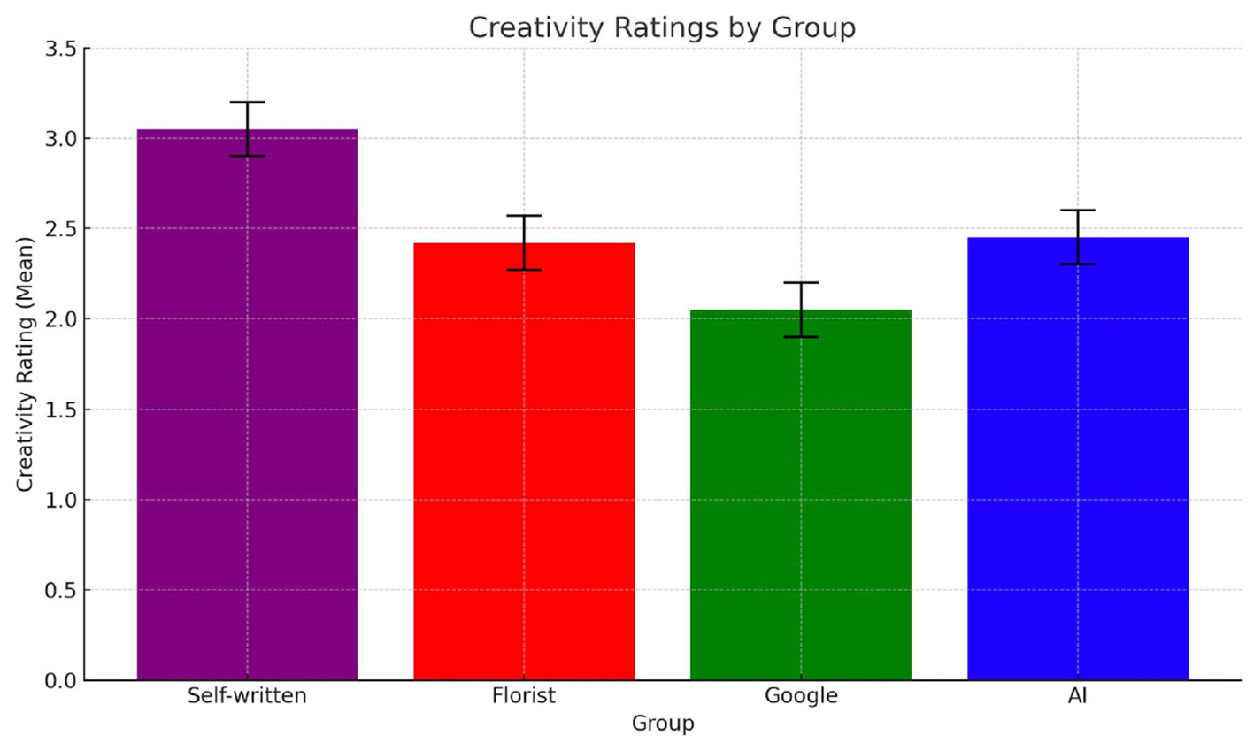 Mean creativity ratings across the four groups evaluating the card written by different sources: self-written by a friend (purple); written by a florist (red); found on Google (green); AI-generated (blue).
