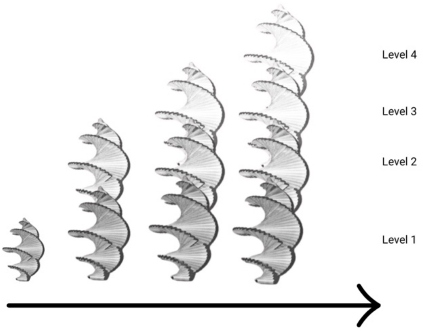The spiral captures the phenomenon of rhythmic change over time with expansion and contraction. It does not capture the phenomenon of reorganization or transformation. If we combine Figures 3, 4, we have something that combines the spiral form with reorganization: emerging spirals over the course of development (see Figure 5). We will draw on this latter form to discuss the development of the ecological self.