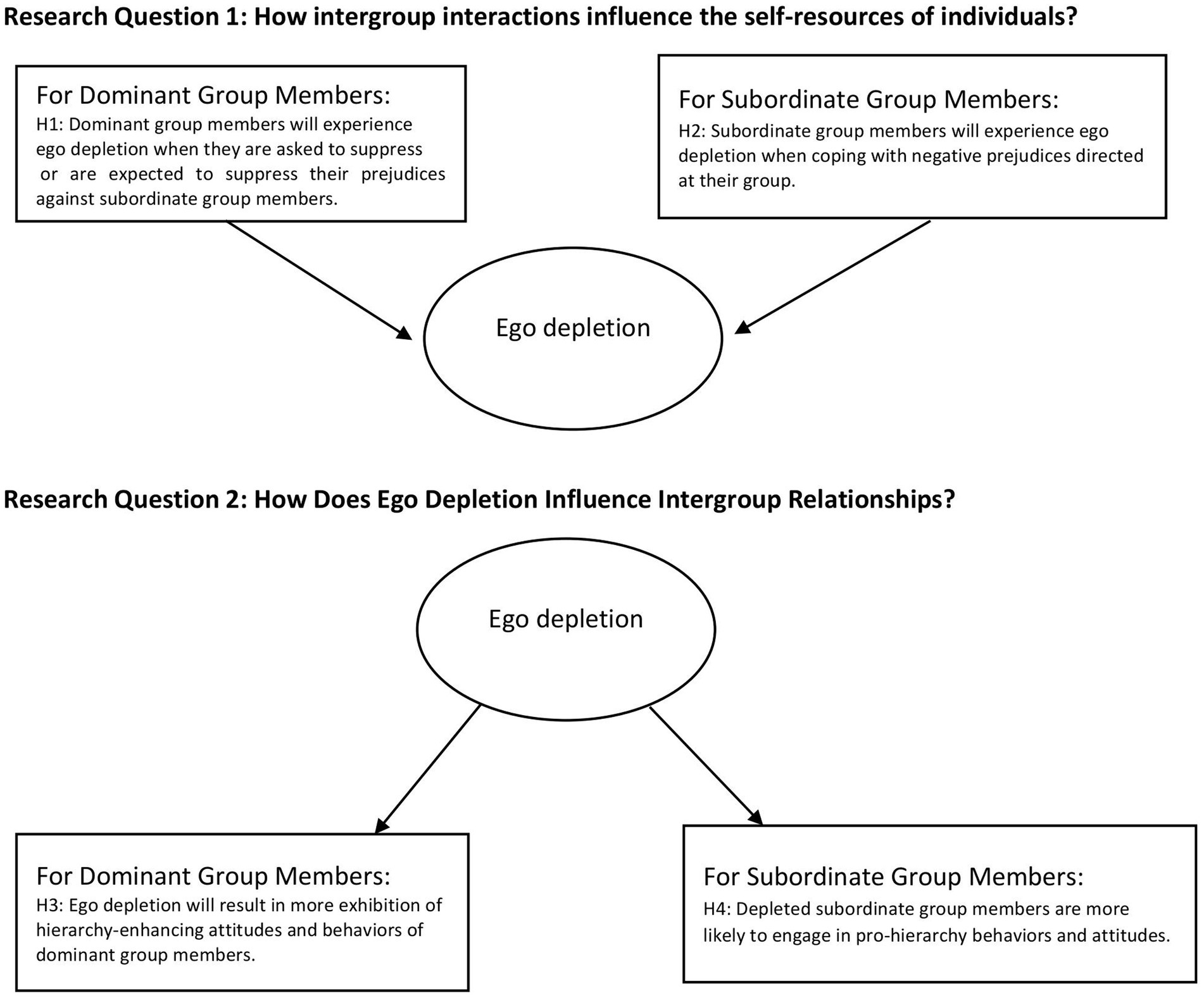 This review addresses two critical research questions (RQ): (1) How intergroup interactions influence the self-regulatory processes of individuals? and (2) How ego depletion, in turn, shapes the outcomes of intergroup interactions? At first glance, answers to these questions seem contradictory: While some studies have reported that the experience of ego depletion exacerbates prejudicial attitudes (e.g., Ma et al., 2013; Zhang and Peng, 2020), others have shown that depletion tends to have mitigating consequences in intergroup interactions (Koslov, 2010). A closer look reveals that these variations are deeply rooted in whether an individual belongs to a subordinate or dominant group, shaping both the antecedents and consequences of ego depletion. These distinctions are critical in sustaining and reinforcing hierarchical structures, demonstrating how self-regulatory processes can perpetuate systemic inequalities. Based on this observation, these findings can be examined separately for dominant and subordinate group members through the lens of social dominance theory (SDT), a prominent theory in social psychology that suggests societies are structured based on group-based hierarchies, and these hierarchies are sustained not through constant conflict but via societal consensus (Sidanius and Pratto, 1999).