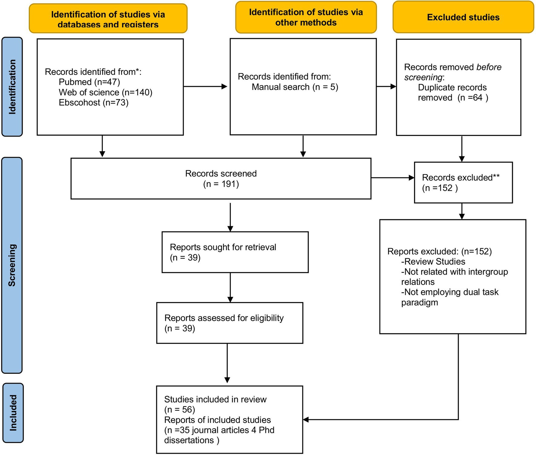 Studies were included in the present review if they (a) employed an experimental or quasi-experimental research design, (b) examined ego depletion within the framework of the dual-task paradigm—that is, involving a manipulation task followed by a measurement task, which could take one of two forms: (i) studies examining the effects of group interactions on ego depletion, and (ii) studies employing ego depletion manipulations followed by assessments of group interactions or related outcomes—and (c) included participants or targets from either dominant or subordinate social groups, or both. Based on these criteria, 39 research reports (35 journal articles and four unpublished doctoral dissertations, comprising a total of 56 studies) were retained for analysis out of the 65 initially identified (see Figure 2 for the PRISMA flowchart).
