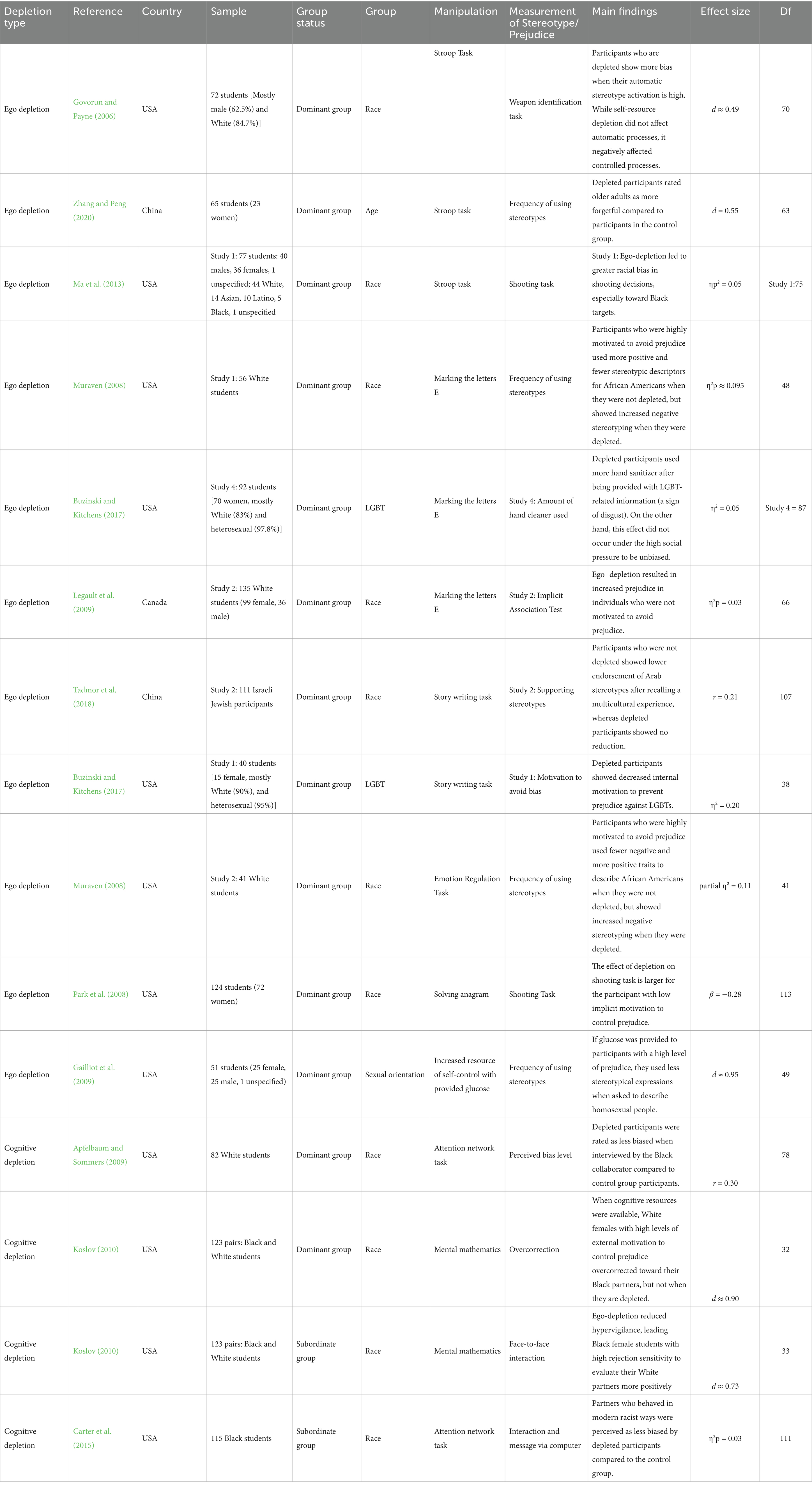 This section summarizes the findings from a total of 15 studies. Thirteen of these studies examined ego depletion among dominant group members, while only two focused on subordinate group members. Most of the studies included participants from various racial groups (N = 11), with one study involving different age groups (N = 1) and three studies including participants of various sexual orientations (N = 3).