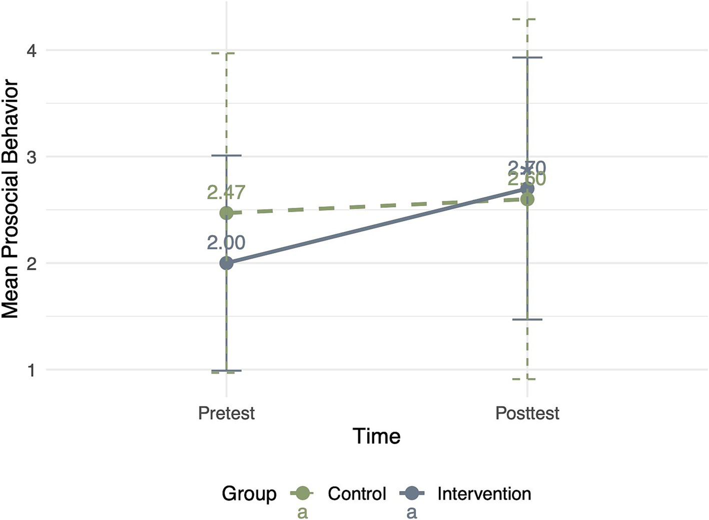 Changes in prosocial behavior from pretest to posttest in the intervention and control groups.