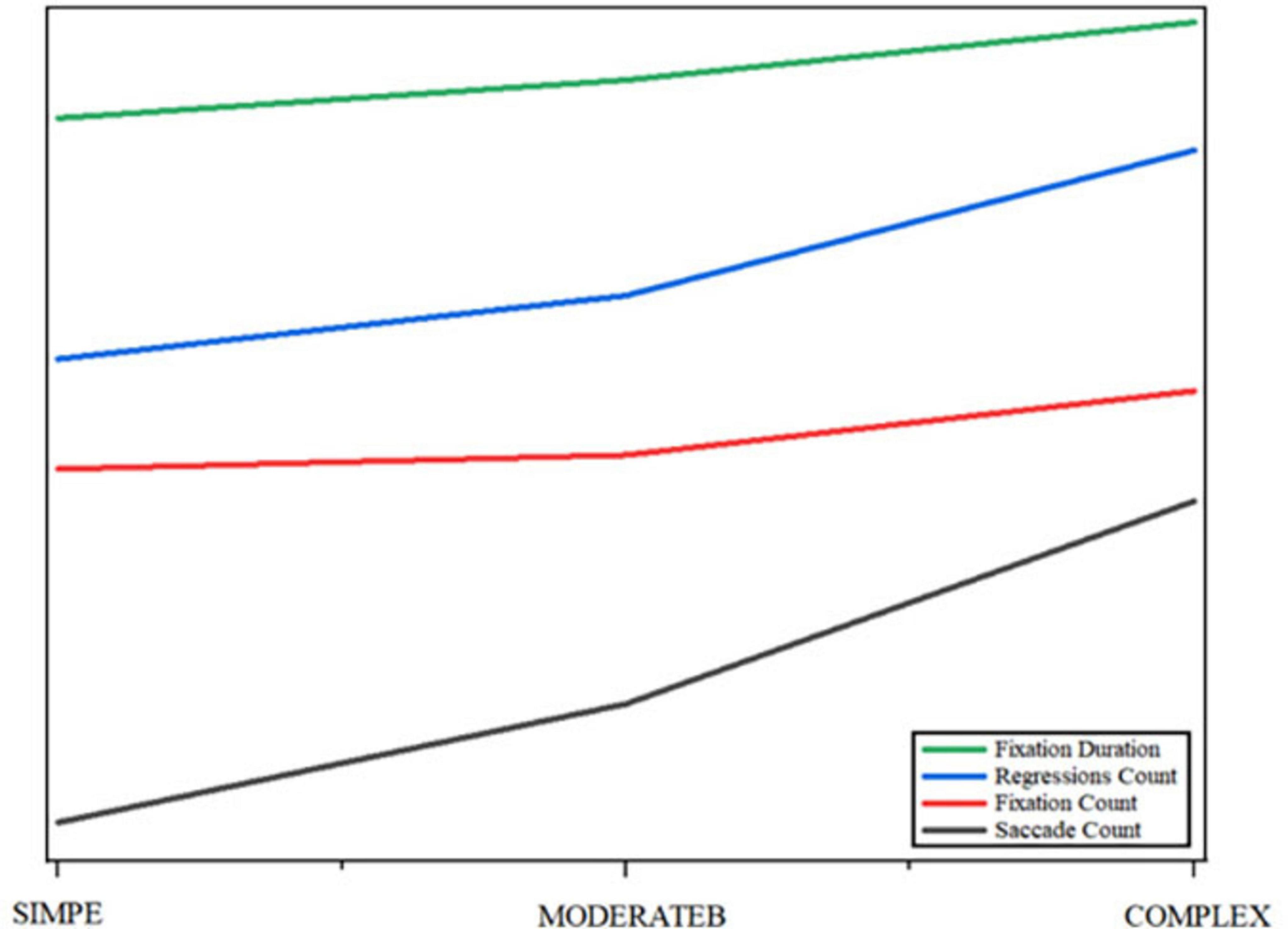Fixation Duration: Refers to the time the eyes remain at a fixed position. A longer fixation duration is usually associated with higher cognitive load, especially when encountering more difficult sentences. Regression Count: Refers to the number of times the eyes return from a later position to an earlier one. A higher number of regressions indicates that the translator encountered difficulties in understanding or processing the translation content, requiring additional cognitive resources for information review. Saccade Count: Refers to the number of times the eyes move from one fixation point to another. Frequent saccades may indicate that the translator’s attention shifts rapidly during translation, reflecting dynamic changes in information processing. Fixation Count: Refers to the number of different positions the eyes stop at during the translation process. A higher fixation count indicates the complexity of the translation text or the translator’s in-depth processing of the text.
