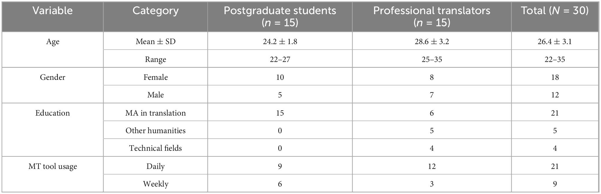 The participants in this study were 30 postgraduate students or professional translators with some translation experience. Participants included 15 graduate students with basic translation training (average experience = 1.5 years) and 15 professional translators (average experience = 6 years). All participants passed a standardized English proficiency test (CET-6550 or TEM-870) and reported their weekly use of the MT tool. Group differences were controlled for in subsequent analyses. Demographic information is shown in Table 1. According to the preliminary research results, the participants were required to complete two types of Chinese-English translation tasks: one is a human translation task, and the other is a human-machine collaborative translation task. In the human-machine collaborative translation task, the machine translation system will generate a preliminary translation, and the participants need to make corrections based on the machine translation results.