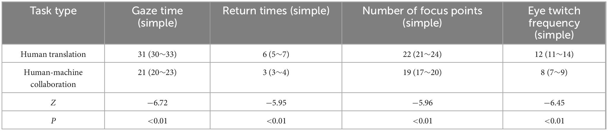 According to Table 2, the eye tracking data (fixation time, number of regressions, number of fixations, number of saccades) differed between task type, simple task, and text type (human translation and human-computer collaborative translation). In the simple task, the human translation value of fixation time was 31 (30∼33), and the human-computer collaborative translation value was 21 (20∼23), Z = −6.724, P < 0.01. It can be seen that the fixation time in the human translation task is significantly longer than that in the human-robot collaborative translation task. This may indicate that human translators need more time to understand and generate the translated content during the translation process, resulting in longer fixation times. The human translation value of the number of regressions was 6 (5∼7), and the human-computer collaborative translation value was 3 (3∼4), Z = −5.945, P < 0.01. The number of regressions in human translation is significantly higher than that in human-computer collaborative translation. This may be due to the fact that human translators frequently review the original text during the translation process to confirm the accuracy of the translation or to understand some complex content. The human translation value of fixation points was 22 (21∼24), and the human-computer collaborative translation value was 19 (17∼20), Z = −5.961, P < 0.01. The number of fixations in human translation is significantly higher than in human-machine collaborative translation. This may mean that during human translation, the translator’s visual focus is more widely distributed, requiring frequent attention to different areas of text. The human translation value of saccade number was 12 (11∼14), and the human-computer collaborative translation value was 8 (7∼9), Z = −6.449, P < 0.01. The number of saccades in human translation is also significantly higher than that of human-computer collaborative translation, indicating that human translators need to switch their attention more frequently during the translation process, and human-computer collaborative translation reduces this switching with the help of tools.