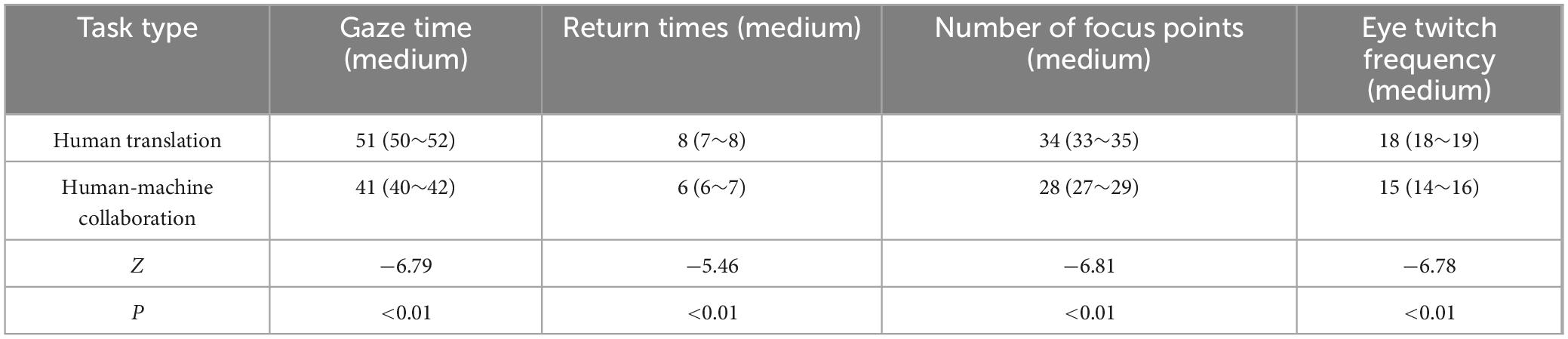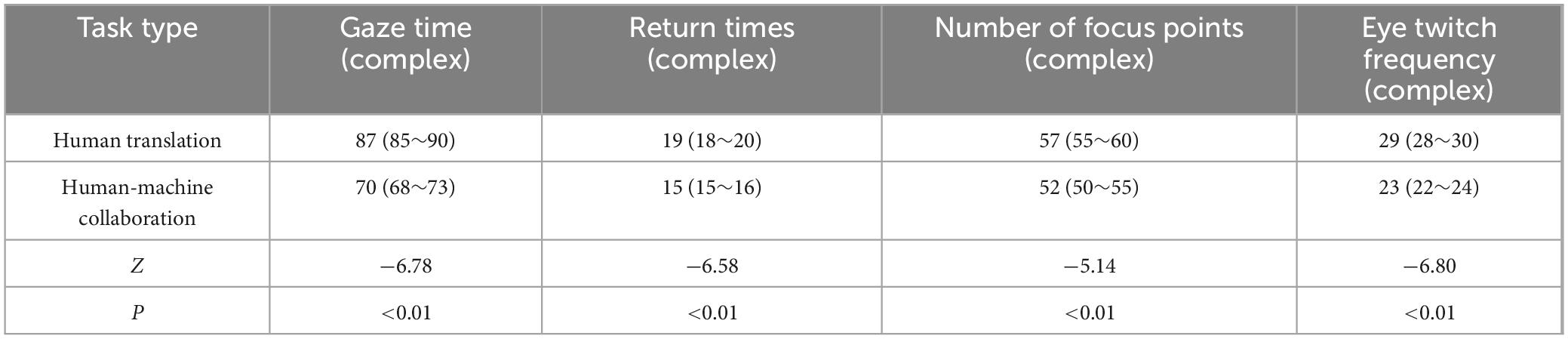 As indicated in Table 4, the fixation time values in complex tasks were 87 (85∼90) for human translation and 70 (68∼73) for human-computer collaborative translation, Z = −6.775, P < 0.01. As the complexity of the task increases, the gaze time of a human translator increases significantly, likely because complex texts require more time to understand, analyze, and translate. The human translation value of the number of regressions was 19 (18∼20), and the human-computer collaborative translation value was 15 (15∼16), Z = −6.584, P < 0.01. In complex tasks, the number of regressions by human translators is significantly higher than that of human-computer collaborative translation, which may be related to the need to repeatedly review and revise the translated content for complex tasks. The human translation value of fixation points was 57 (55∼60), and the human-computer collaborative translation value was 52 (50∼55), Z = −5.144, P < 0.01. The number of fixations in human translation is higher than that in human-machine collaborative translation, indicating that human translators are likely to process more areas of text when faced with complex tasks. The human translation value of saccade was 29 (28∼30), and the machine co-translation value was 23 (22∼24), Z = −6.806, P < 0.01. The number of saccades of human translators is significantly higher than that of human-computer collaborative translation, indicating that the attention of human translators switches between different parts more frequently in complex tasks.