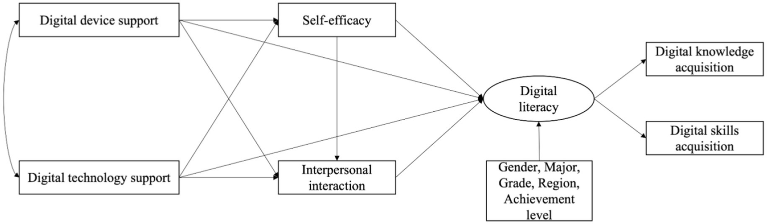 Digital support is defined as the comprehensive institutional services related to digital education provided to college students. This includes hardware support, which refers to the availability of digital learning equipment supplied by colleges, such as computers, digital learning tools, software, and digital audio equipment. Additionally, it encompasses digital technical support aimed at training students in the use of various digital tools, including network application technology, software operation, and different forms of digital literacy training (Park, 2011). Furthermore, the concept can be expanded to include digital policy support from colleges as well as assistance from faculty and peers (Chiu, 2021; Strobl et al., 2019). Overall, digital support can significantly enhance students’ learning experiences and overall digital literacy. To the best of our knowledge, no previous research has directly revealed the relationship between digital support in higher education and digital literacy of college students. Relevant studies suggest that digital support systems promote student engagement in multimedia information processing by enriching learning environments, enhancing emotional involvement, and fostering enjoyable learning experiences (Chiu, 2021). Other studies have demonstrated the importance of digital devices, such as mobile-enabled creation platforms (e.g., iPad, iMovie) play a pivotal role in developing multimodal digital narratives, with demonstrated efficacy in advancing students’ technological competencies and critical digital literacies (Churchill, 2020). Similarly, digital device functionality is increasingly recognized as a critical dimension of digital media literacy, as the complexity of digital literacy requires the support of a variety of tools (Park, 2011). Another teacher-based study found that manipulating information and communications technology (ICT) plays a crucial role in the development of teachers’ digital literacy, with mastery of app manipulation techniques particularly improving teachers’ digital literacy (Sulasmi, 2022). Therefore, both digital technology support and digital device support are closely related to the digital literacy of college students.