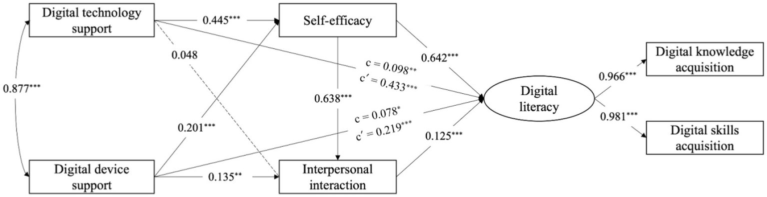 The results showed that both digital device support and digital technology support positively predicted digital literacy, and self-efficacy and interpersonal interaction mediated the relationship between digital device support and digital literacy. Self-efficacy mediated the relationship between digital technology support and digital literacy, while interpersonal interaction had a non-significant mediating effect in this relationship. Additionally, self-efficacy significantly predicted interpersonal interaction, forming a chain mediation effect between digital device support, digital technology support, and digital literacy.
