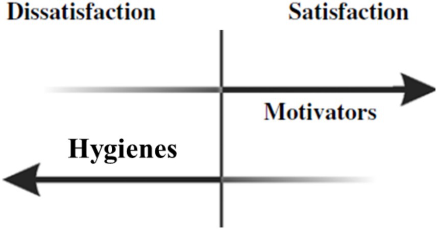 One of the first widely cited sources to discuss unipolar constructs of satisfaction and dissatisfaction and the extent to which they interact is Herzberg’s two-factor theory (Herzberg et al., 1959), also known as Herzberg’s motivation-hygiene theory. Developed after analyzing interviews engineers and accountants, this theory suggests that job satisfaction and dissatisfaction are not merely opposite ends of a bipolar spectrum but are instead separate, distinct dimensions (Herzberg et al., 1959). According to the theory, two distinct sets of factors contribute to these dimensions: hygiene factors and motivation factors (Herzberg et al., 1959). Figure 1 visually represents motivators’ and hygienes’ differential contributions to (dis)satisfaction, which we expand upon below.
