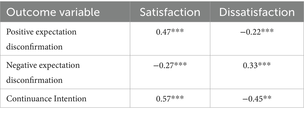We compared a two-factor model, in which satisfaction and dissatisfaction were modeled as distinct latent variables, with a one-factor model, in which all items loaded on a single latent factor. Statistically, the one-factor model fit the data better (χ2 = 36.32, df = 8, CFI = 0.96) than the two-factor model (χ2 = 156.43, df = 25, CFI = 0.90). While these fit indices suggest some empirical overlap, several other indicators support the two-factor conceptualization. The correlation between the latent constructs was moderate (r = −0.48), discriminant validity criteria were met (HTMT = 0.55 < 0.85), and the constructs displayed distinct nomological patterns. As shown in Table 1, satisfaction correlated positively with positive disconfirmation (r = 0.47, p < 0.001) and continuance intention (r = 0.57, p < 0.001), whereas dissatisfaction correlated positively with negative disconfirmation (r = 0.33, p < 0.001) and showed weaker, often inverse, associations with the other constructs. Taken together, these results indicate that although the one-factor model offers a more parsimonious statistical fit, the two-factor specification is theoretically meaningful and empirically supported when considering discriminant validity, differential antecedents, and incremental predictive utility.