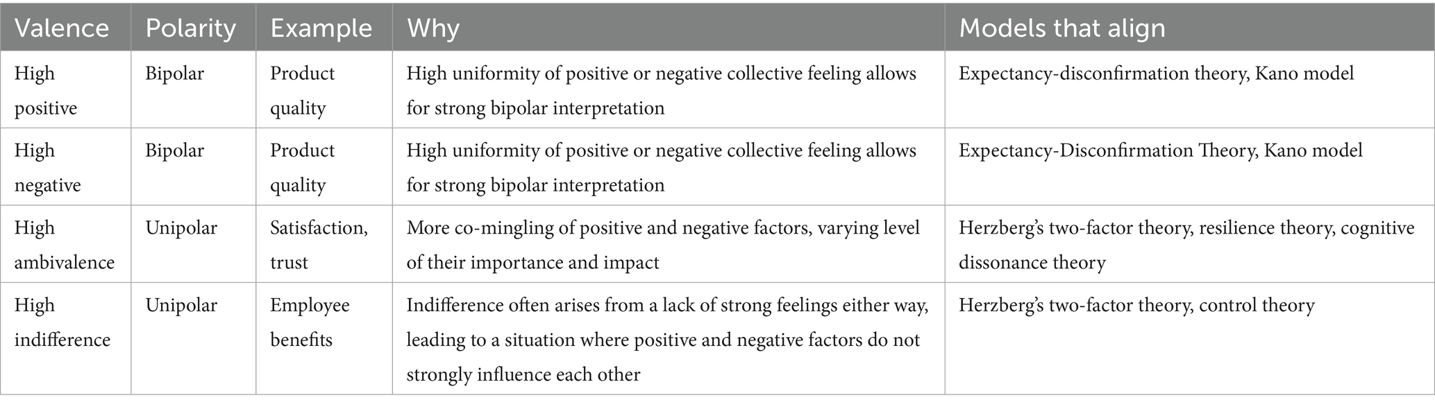 Herzberg’s two-factor theory illustrates that satisfaction and dissatisfaction are distinct constructs rather than simply opposite ends of a spectrum. This distinction mirrors broader psychological frameworks that explore how positive and negative emotional experiences are processed separately in the human mind. By discussing psychological models like Watson and Tellegen’s Circumplex Model of Affect and Cacioppo’s Evaluative Space Model, we further expand this concept by demonstrating how ambivalent states with mixtures of positive and negative emotions can exist independently, providing a deeper understanding of complex emotional states that cannot be captured by a single bipolar continuum.