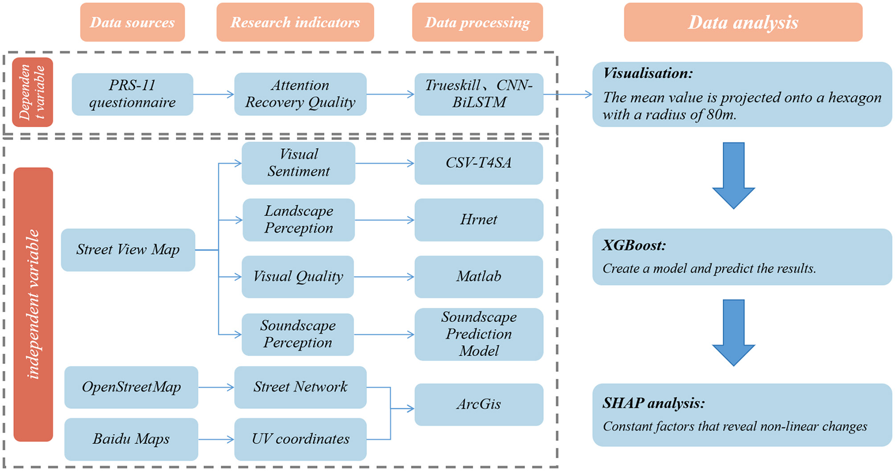 To address the triple limitations of extant studies in campus audiovisual restorative assessment—i.e., unimodal perception limitation, linear analysis limitation, and static data limitation—the present study integrates PRS-11, SVI, CSV, T4SA, soundscape prediction, and geoanalysis methods through the innovative framework of “multi-source perception fusion—non-linear mechanism analysis—dynamic assessment iteration.” The integration of T4SA, soundscape prediction, and geoanalysis methods (Figure 2) has been shown to produce a synergistic effect. The experiment integrates the unique strengths of various machine learning methods and proposes a system that can be regularly run offline or online by continuously learning from streaming social media data. The “Cross-modal Distillation Paradigm for Constructing Sentiment Perception (CSV-T4SA)” was combined with Trueskill Matching Perception computation (Allouche et al., 2006). The experiment was followed by the utilization of Hrenet and Matlab high-resolution and compatible processing to ensure the quantification of landscape image quality. Concurrently, computer vision is employed to extract the visual features of SVI at four levels: pixel-level features, object-level features, semantic-level features, and scene-level features. These features are then utilized to construct a soundscape prediction model, in which the SVI features and soundscape labels are employed as inputs to train a Gradient Boosted Regression Tree (GBRT) model. The resultant soundscape of cities can be mapped by feeding city-scale SVI features into the learning model (Zhao et al., 2023). Finally, ArcMap software verifies the autocorrelation between different variables and spaces through its spatial autocorrelation analysis and hotspot analysis, which ensures the visibility and readability of the results. Finally, the XGBoost and SHAP algorithms were used to thoroughly examine the reasons behind the changes in the quality of attention restoration.