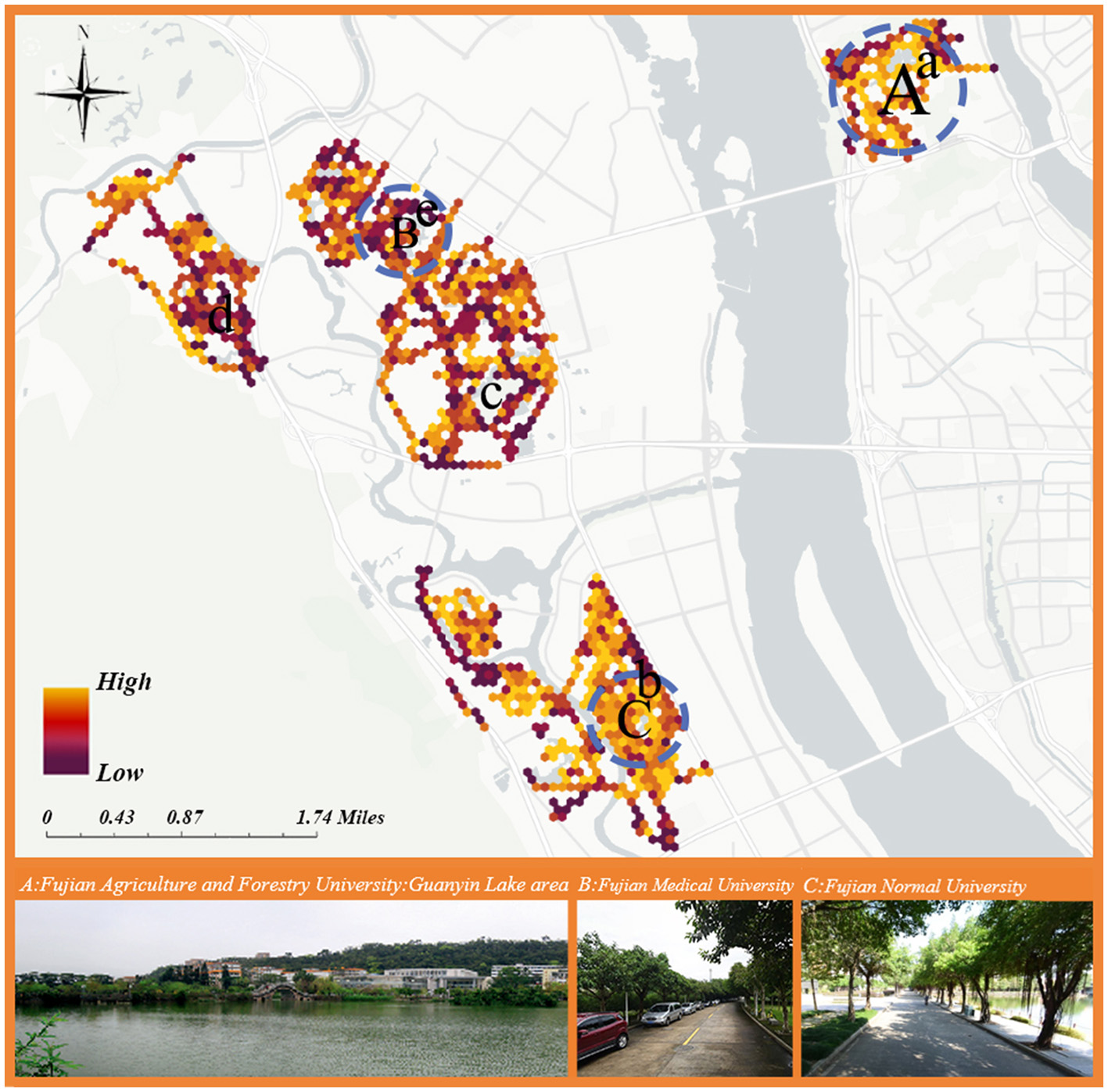 Fuzhou, the capital of Fujian Province in China, is home to Fuzhou University Town, located in Shangjie Town, Minhou County. This multi-functional park seamlessly integrates education, culture, ecology, and daily life. Currently there are 13 colleges and universities, including Fuzhou University, Minjiang College, Fujian University of Technology, Fujian Medical University, Fujian University of Traditional Chinese Medicine, Fujian Jiangxia University, etc. This development not only drives growth in the Shangjie area but also creates a significant clustering effect in Jinshan New District. In terms of location choice, Fuzhou University Town is located in the strategic direction of the city's westward development, with the Qishan Mountain Range to the west and the Wulong River to the east, providing a superior natural ecological environment. In addition, the study area joins the Jinshan Campus of Fujian Agriculture and Forestry University, which is known as an “ecological garden university”. Guanyin Lake is the largest artificial lake in the campus, which is also an important channel for teachers and students to experience the natural landscape and ecological culture, and it can provide a control experimental group. Therefore, the study area includes Fuzhou University, Fujian Normal University, Minjiang College, Fujian Medical University, Fujian Jiangxia University, Fujian University of Traditional Chinese Medicine, and Jinshan Campus of Fujian Agriculture and Forestry University. Figure 1 shows the extent of the study area.