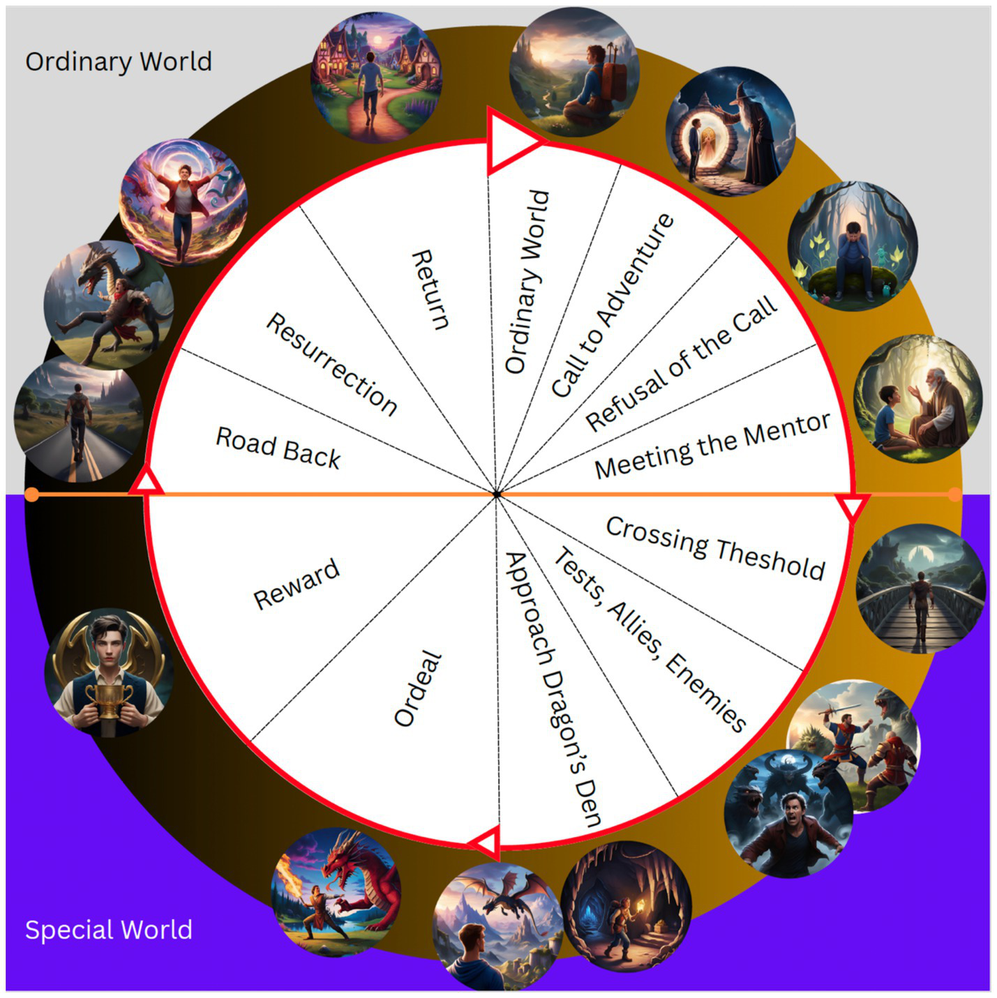 Figure 2. Illustration of the Hero’s Journey using the stages outlined in Winning the Story Wars (Sachs, 2012, p. 148). Canva’s (2025) generative AI Magic Media tool was used to create each separate image using the prompt structure; “human *ENTER HERO’S JOURNEY STAGE* in fantasy world.” For example, for the ‘meeting the mentor’ stage, the prompt “human meeting mentor in a fantasy world”.