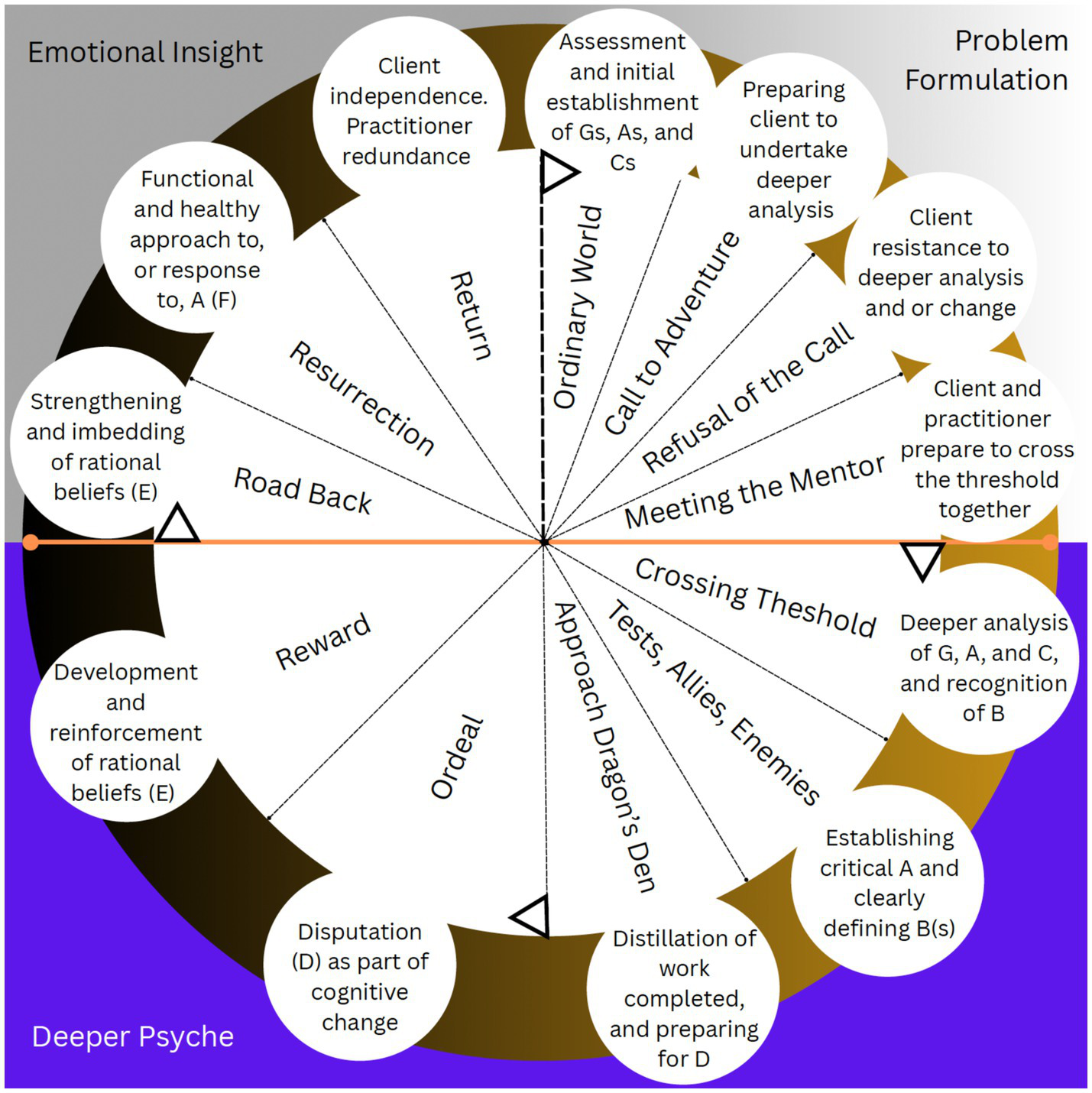 Before I move onto exploring the GABCDE(F) framework within the metaphorical context of the Hero’s Journey, I just want to be clear that I am not the hero in my GABCDE(F) analogy. Just in case you thought you were about to read a self-adulating ego-massage (!). The client is the hero. Bassil-Morozow (2018) in their Jungian toolkit for storytellers suggests that the hero “symbolizes the individuating, progressing human being whose everyday struggle with life and reality is metaphorically presented in the form of superhuman tasks such as dragon-slaying…” (p. 33). In REBT we are not expressly concerned with individuation, but we are trying to support our client-hero with their struggles and reality. Further, the client-hero while not attempting super-human feats, are attempting to achieve something they may have thought they could not (e.g., self-regulation, belief/emotion/behavior change). Thus, painting the client as the hero is appropriate as it pertains to the metaphor of REBT as a Hero’s Journey. Indeed, for many clients, everyday life can be a struggle, and it may help them to characterize their endeavors in a ‘heroic’ narrative (Bassil-Morozow, 2018). As the hero-client moved toward rationality with emotional insight (a chief aim of REBT), they drive their story toward psychic perfection with sage-like rationality, an ideal that is impossible to reach but worth aiming for. Our role as practitioners will become clear later in this piece, but this role is not what I would consider to be ‘heroic’. Of course, a practitioner can embark on their own Hero’s Journey (as all human beings can)—but here I place the client as the central protagonist of the REBM. In articulating the structure and individual elements of the Hero’s Journey, I draw mainly on Vogler’s (2020) work.