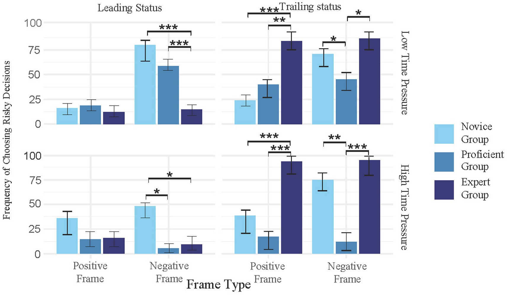 Figure 3. Effects of time pressure, competitive state, frame type and skill level on risk decision-making in tennis players. Error bars represent standard error of the mean (SEM). Asterisks indicate statistical significance levels: *p < 0.05, **p < 0.01, ***p < 0.001.