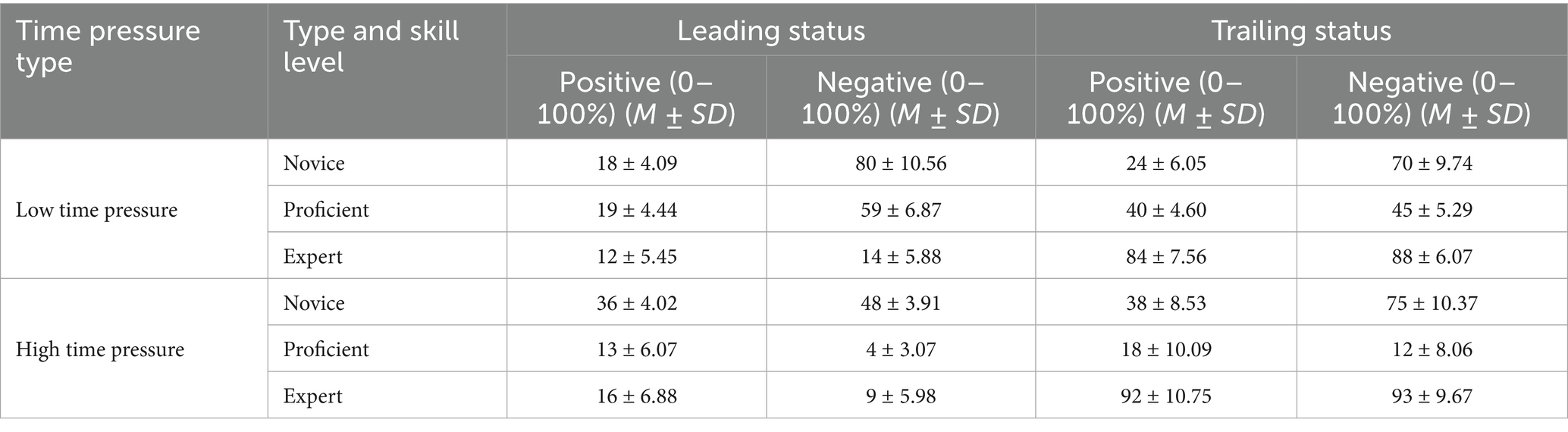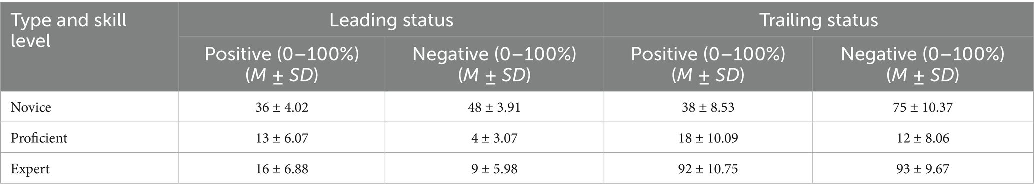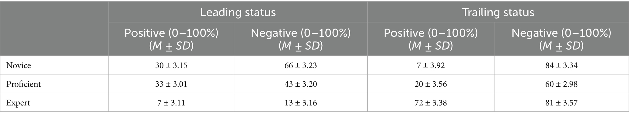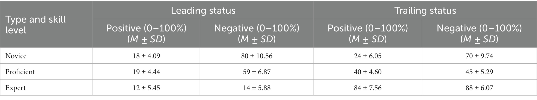 A 3 (Skill Level: novice/proficient/expert) × 2 (Frame Type: positive/negative) × 2 (Competitive State: leading/trailing) mixed-design analysis of variance (ANOVA) was conducted, with frame type and competitive state as within-subject variables and skill level as a between-subject variable (see Figure 1, Table 1).