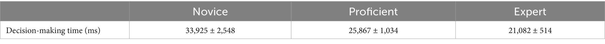Additionally, Experiment 1 demonstrated that novice athletes exhibited significantly longer decision times compared to both proficient and expert athletes, with proficient athletes showing significantly longer decision times than expert athletes.
